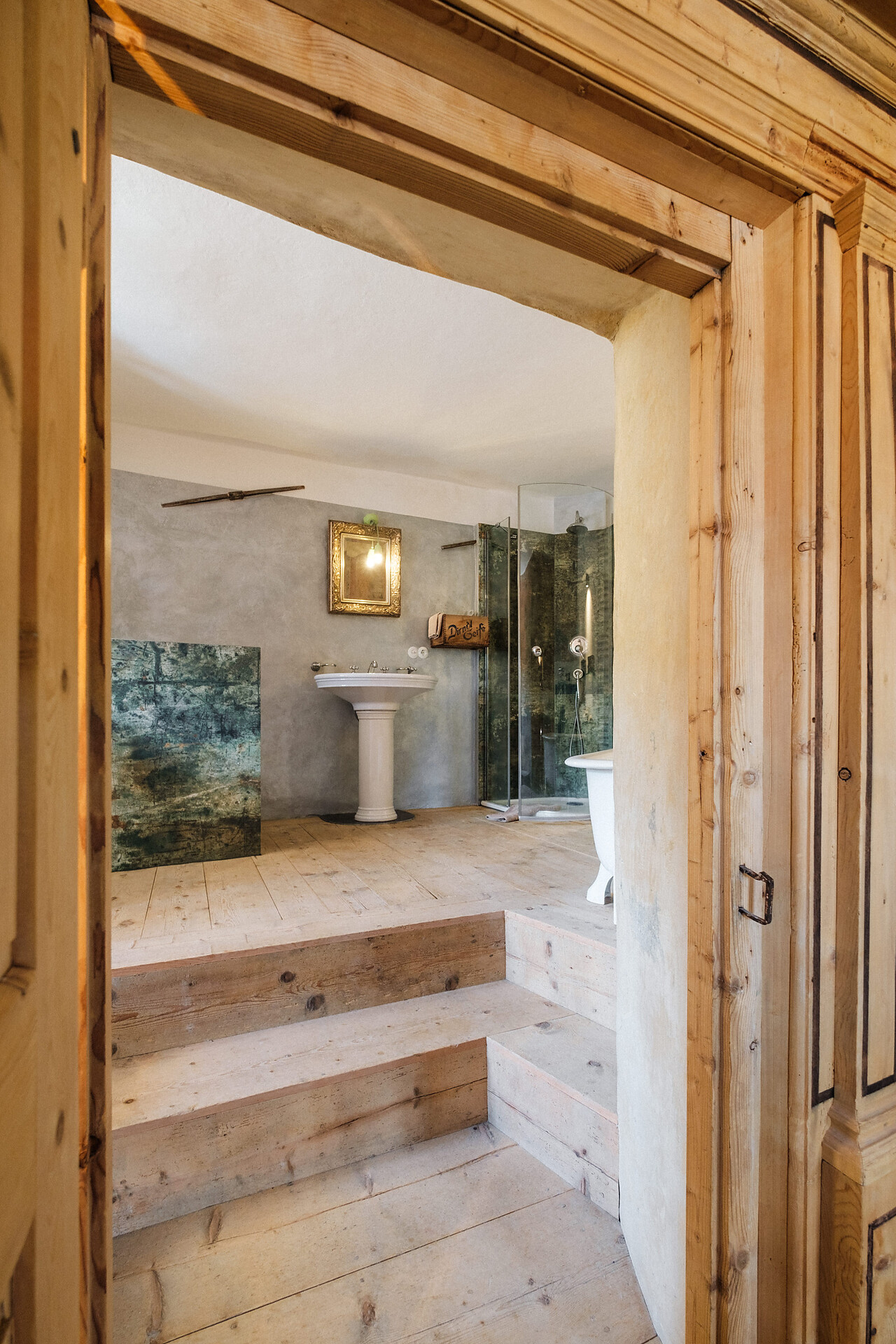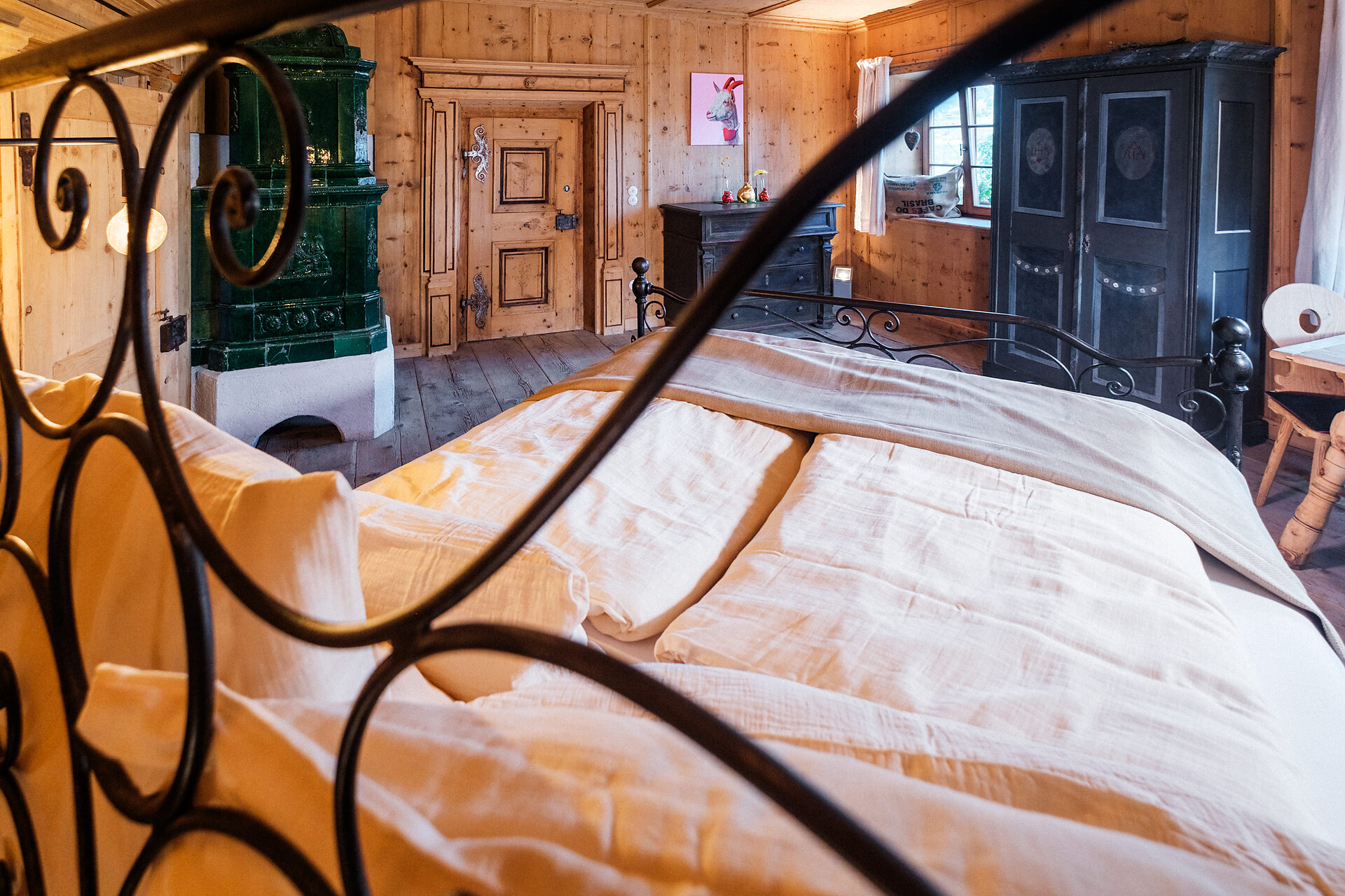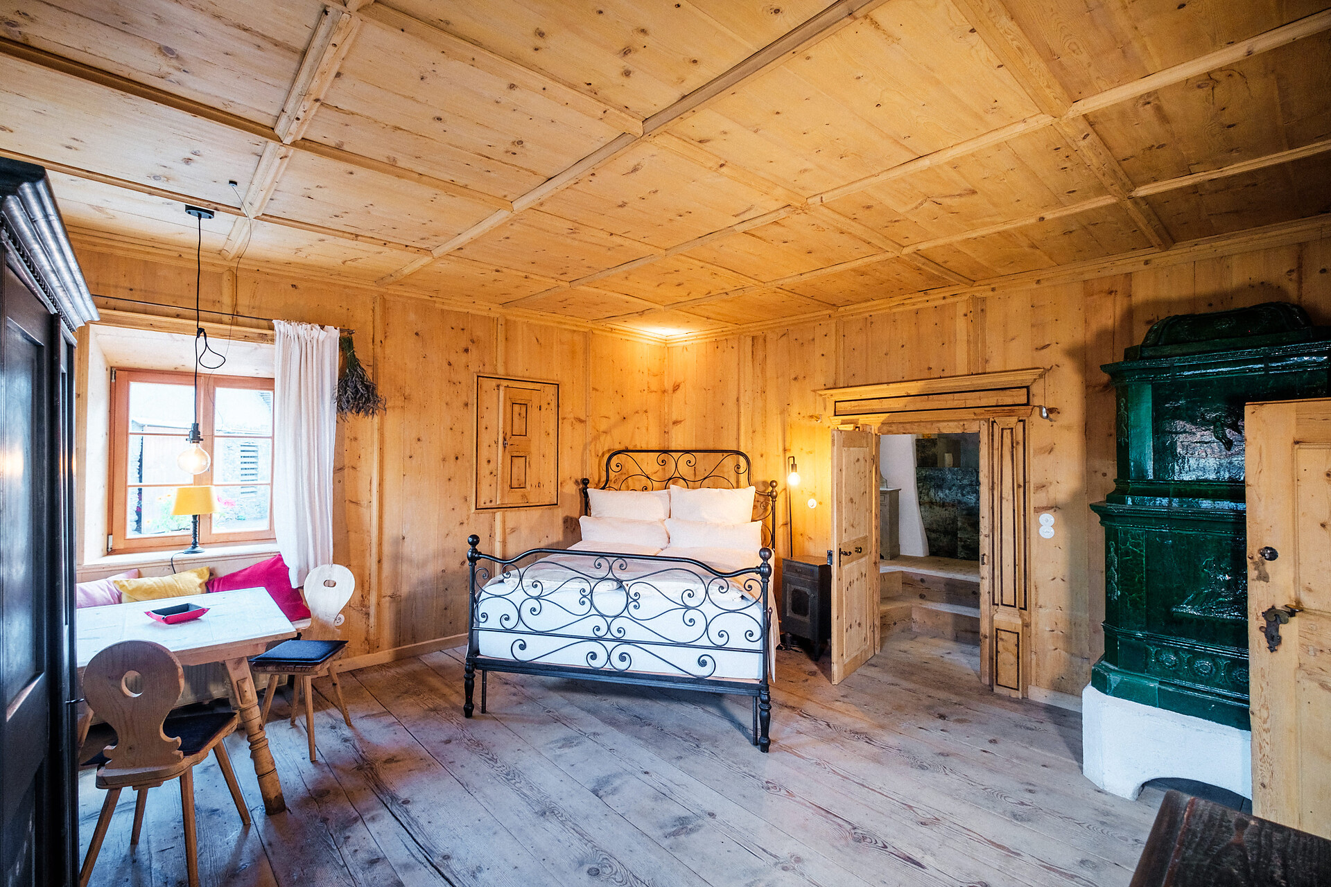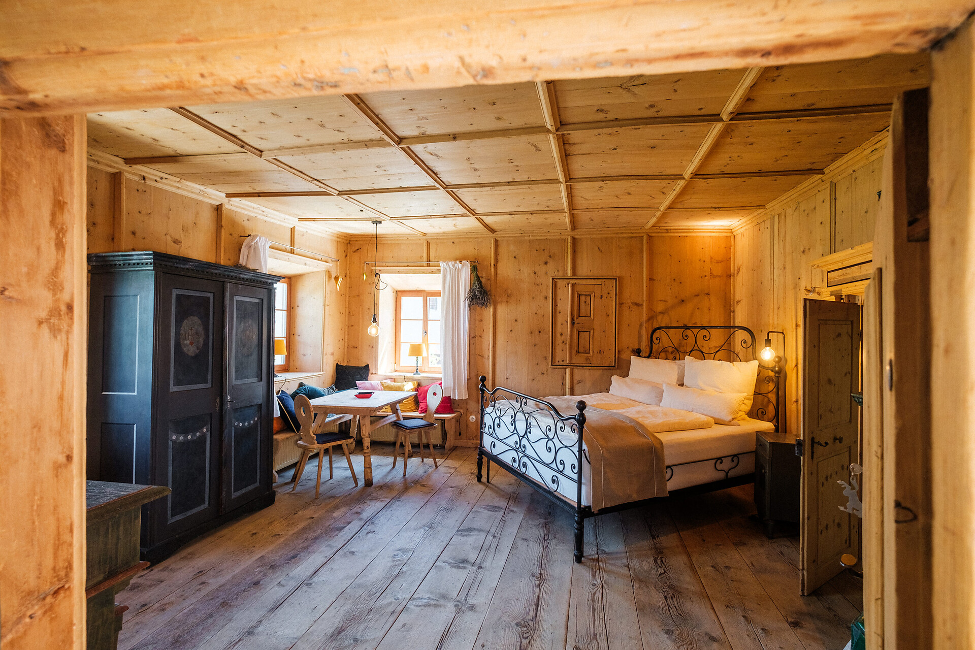 Quando si entra nell'Hotel Weißes Rössl Montechiaro attraverso il pesante portone in legno con la grande serratura in ferro di 500 anni fa, ci si trova nel corridoio sotto una volta a crociera e si vede la scala in pietra che porta alle camere dei piani superiori. Subito a sinistra si trova il salone gotico autenticamente restaurato, dove gli ospiti fanno colazione. Accanto si trova il bar nell'ex Rauchkuchl: acciaio sotto un soffitto affumicato di nero con angoli accoglienti nell'adiacente ex forno per il pane.