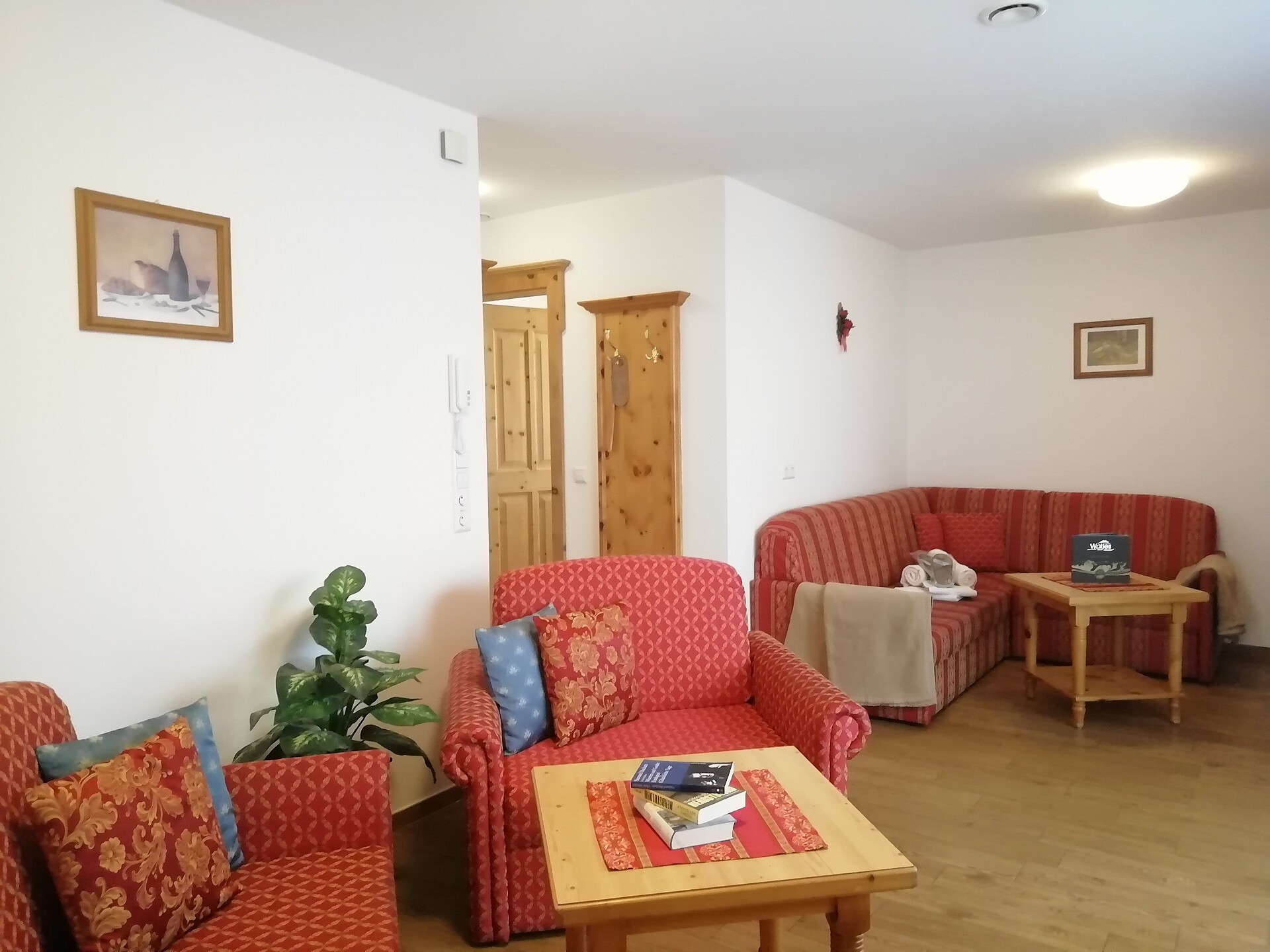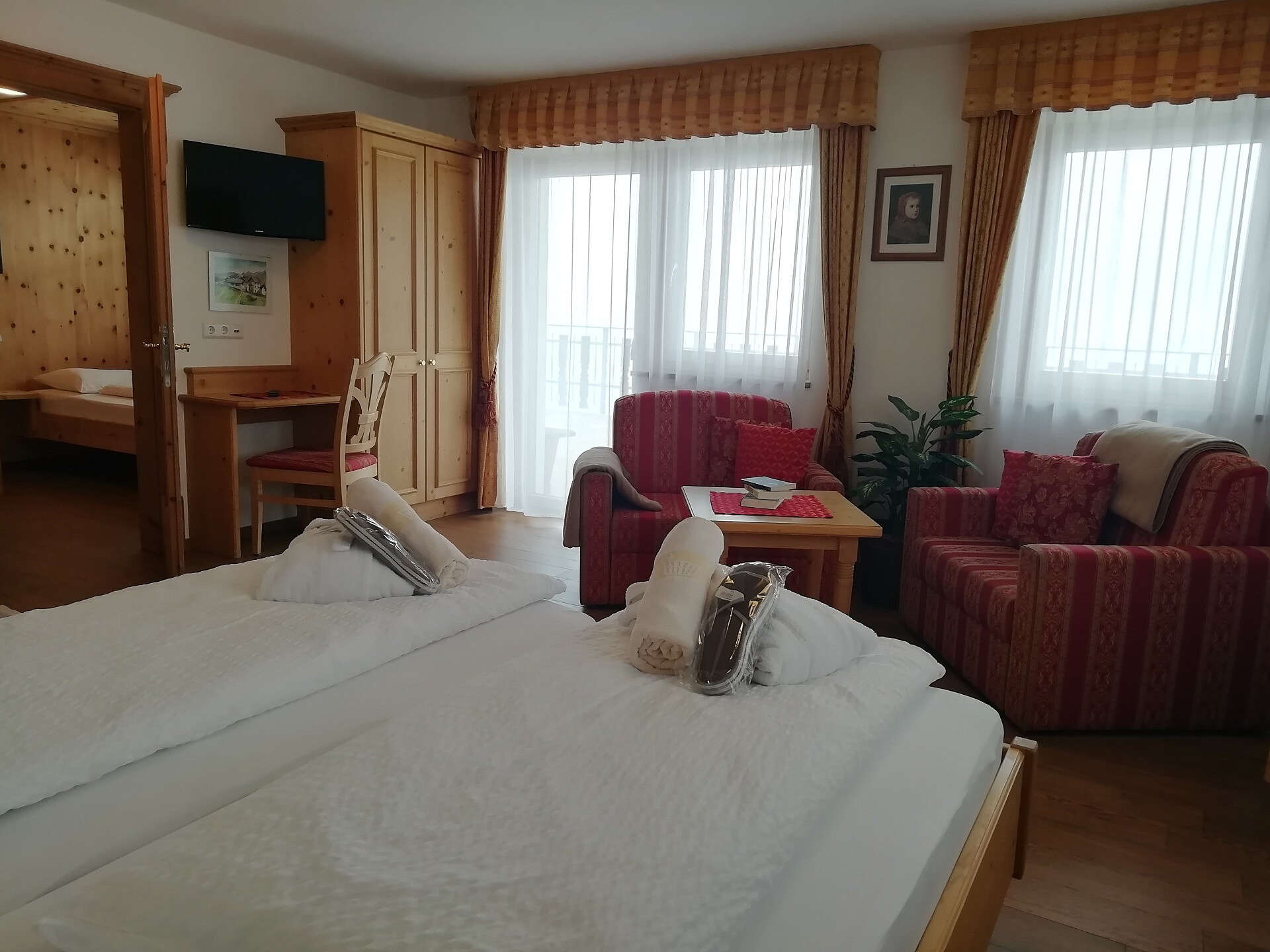 Una camera familiare "Angerlis" arredata di buon gusto di circa 48 m² con un balcone verso est, uno verso sud oppure uno verso ovest con una vista meravigliosa sulla Val Venosta e sulle montagne circostanti.