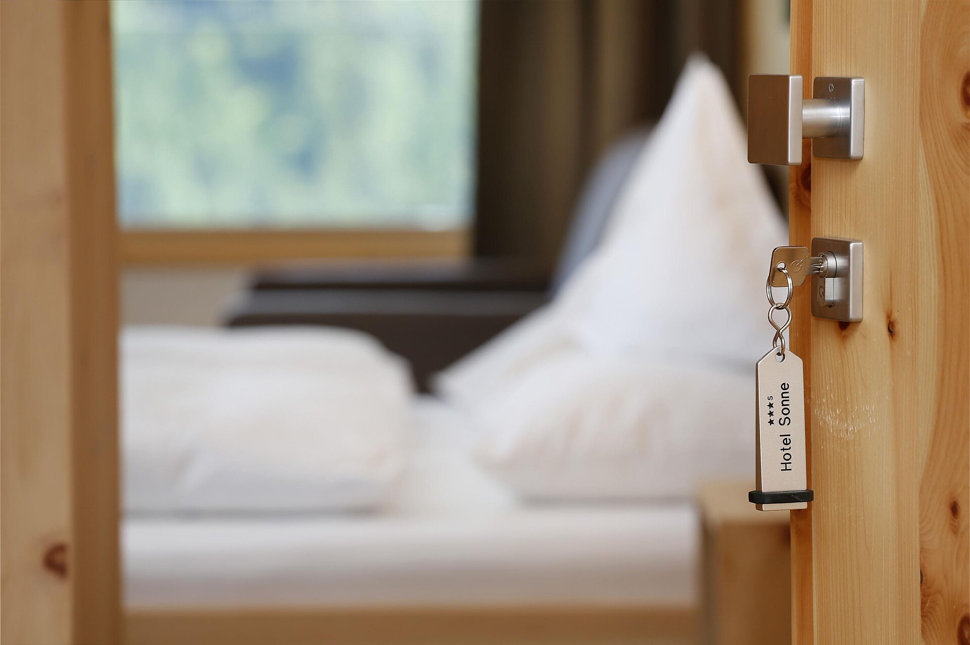 Una grande e comoda suite con due camere separate (camera doppia e camera singola) e locale d'abitazione, doccia e toilette, bidet, e lavandino doppio, asciugacapelli, accappatoi morbidi, divano comodo, TV, accesso WIFI e balcone con vista panoramica sull’Ortles. Ideale per famiglie.