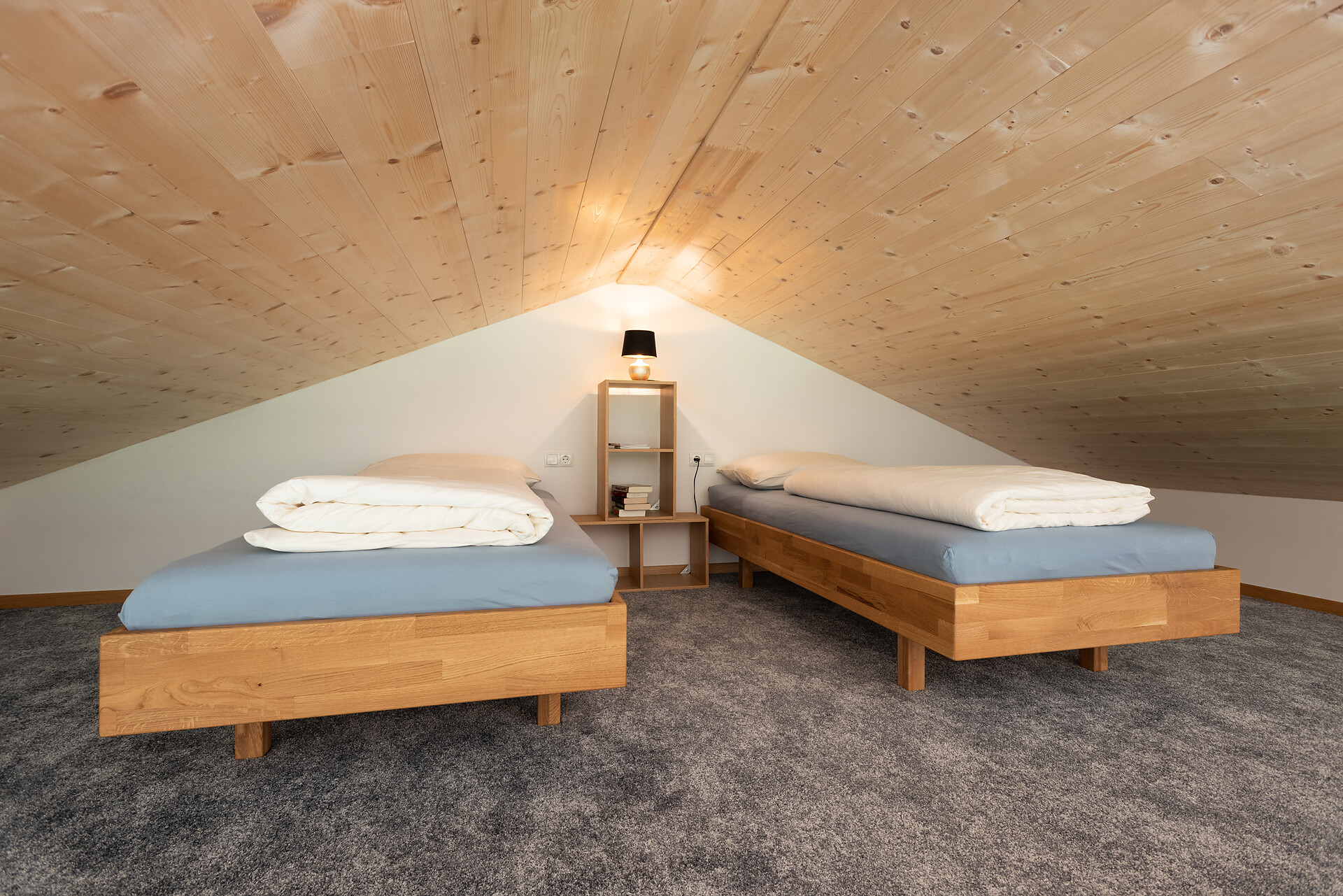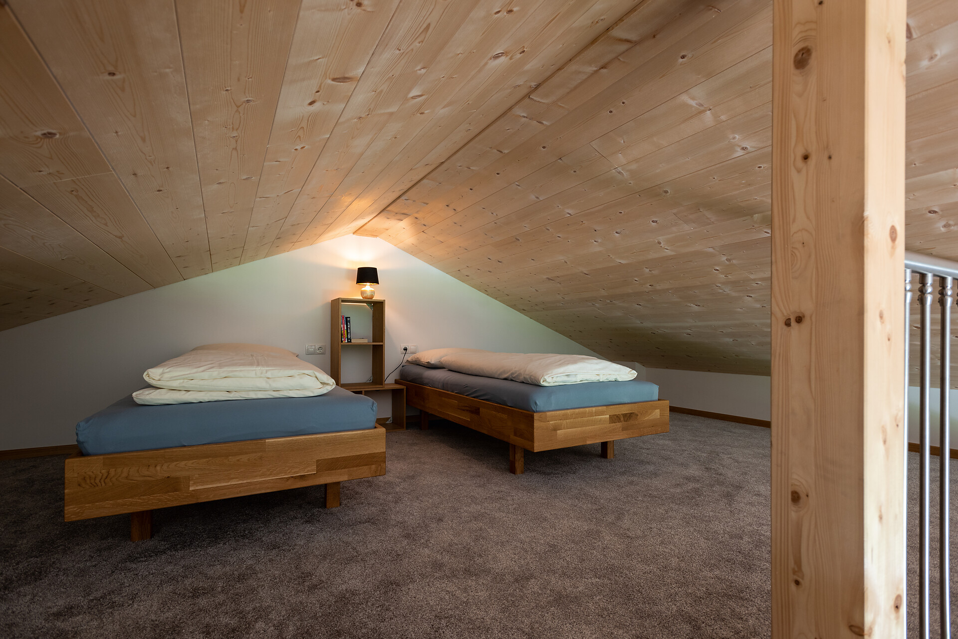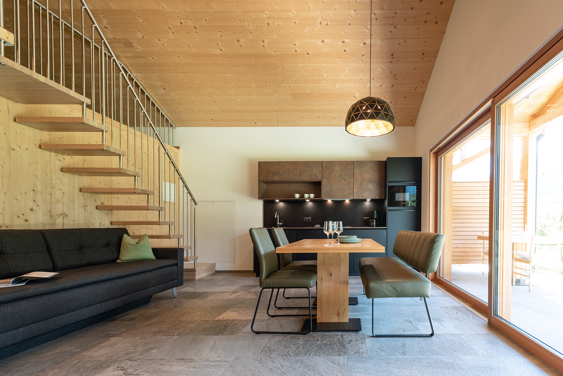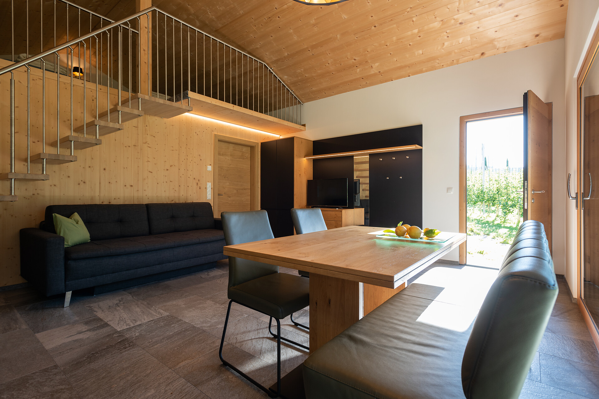 1 chalet di legno 60 m2 con arredamento di alta qualità con terrazzo e spaziosa area esterna, 1 camera da letto con letto matrimoniale, 1 soffitta con 2 letti singoli (Altezza 1,65 m – 20 m2), 1 cucina abitabile completamente e generosamente attrezzata e bagno.
