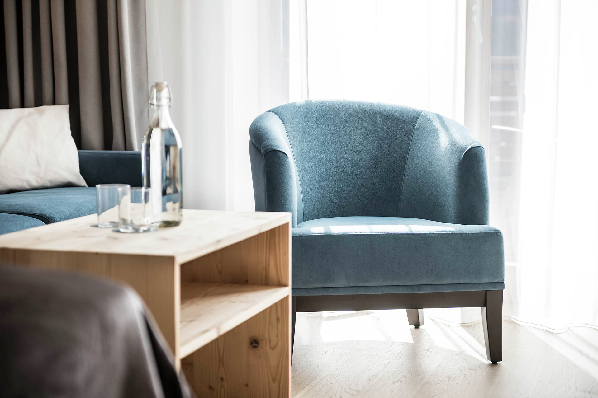 Junior Suite Palü (ca. 38 m²), per 2-4 persone, suite nella struttura principale, interni in abete rosso invecchiato, pavimento in rovere, zona notte separata e zona giorno per bambini (con letto a castello), balcone a est con vista sulla Val Venosta, bagno con doccia e bidet, due TV a schermo piatto con radio integrata, frigorifero, cassaforte, kit Spa e acqua vitalizzata Grander.