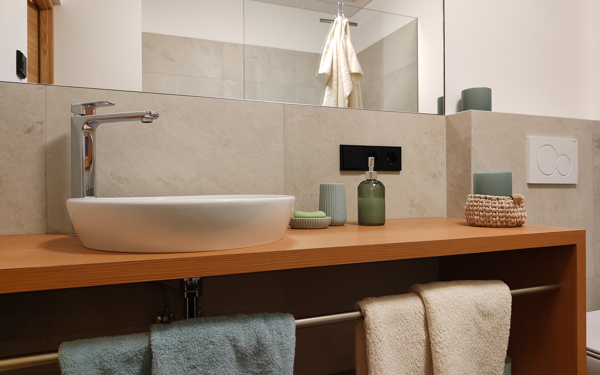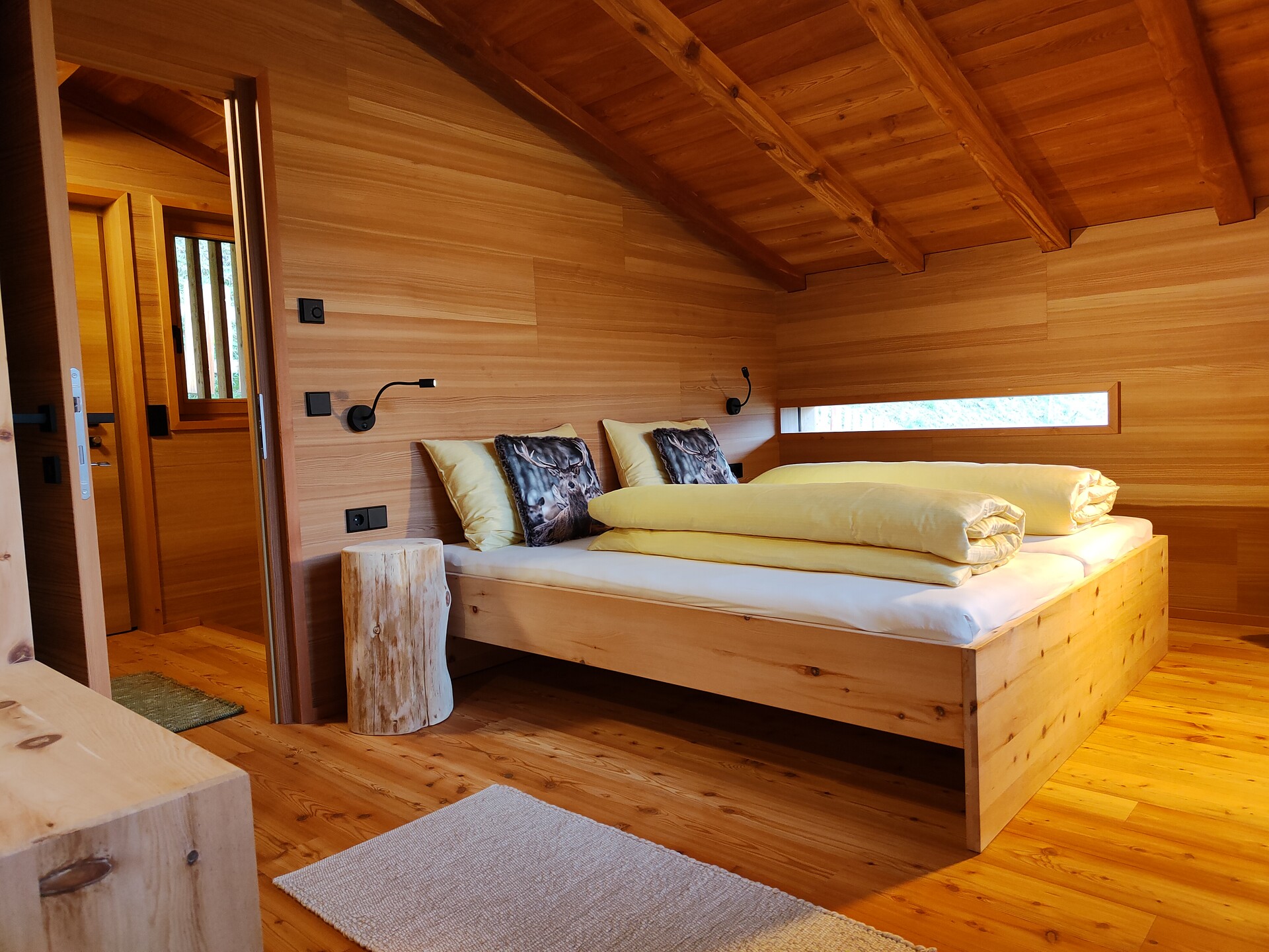Un bagno moderno con doccia a pioggia e doccia normale si trova sul retro del piano terra. Il riscaldamento a pavimento, installato in tutte le stanze dello chalet, offre un piacevole calore e un clima accogliente. I letti in legno di pino cembro e i materassi di alta qualità al piano superiore garantiscono un sonno sano e riposante dopo giornate attive. Da qui si accede anche alla terrazza superiore, da cui si possono osservare meravigliosamente le stelle nelle notti limpide prima di andare a dormire.