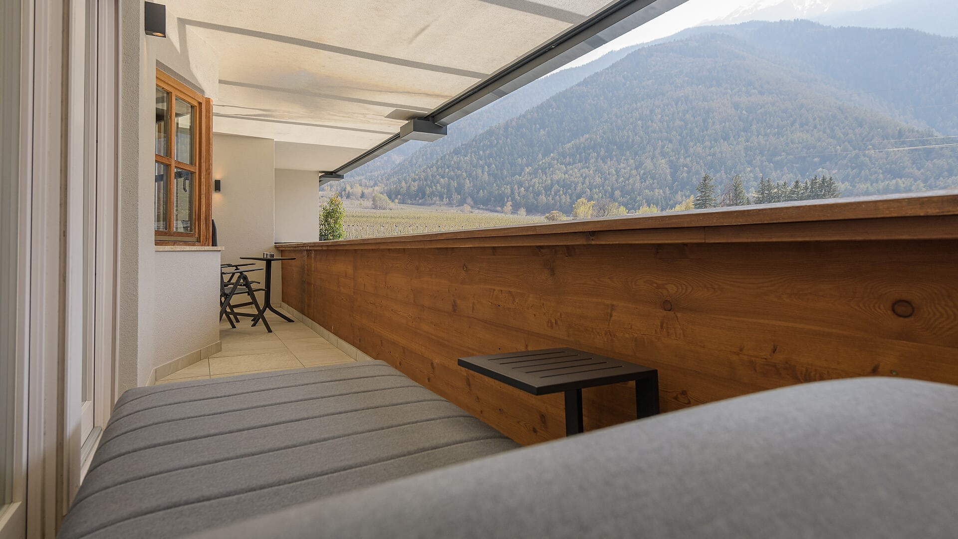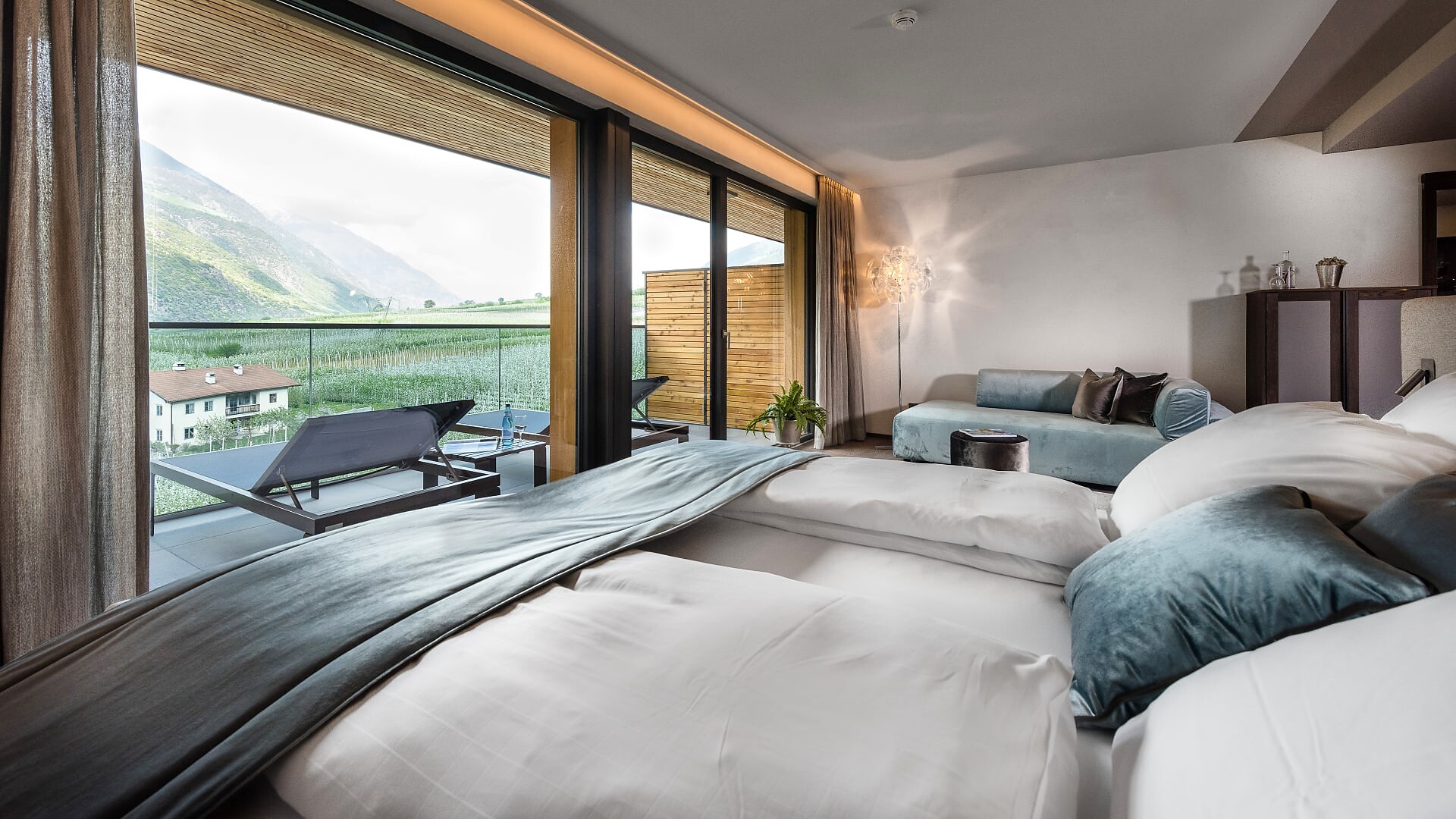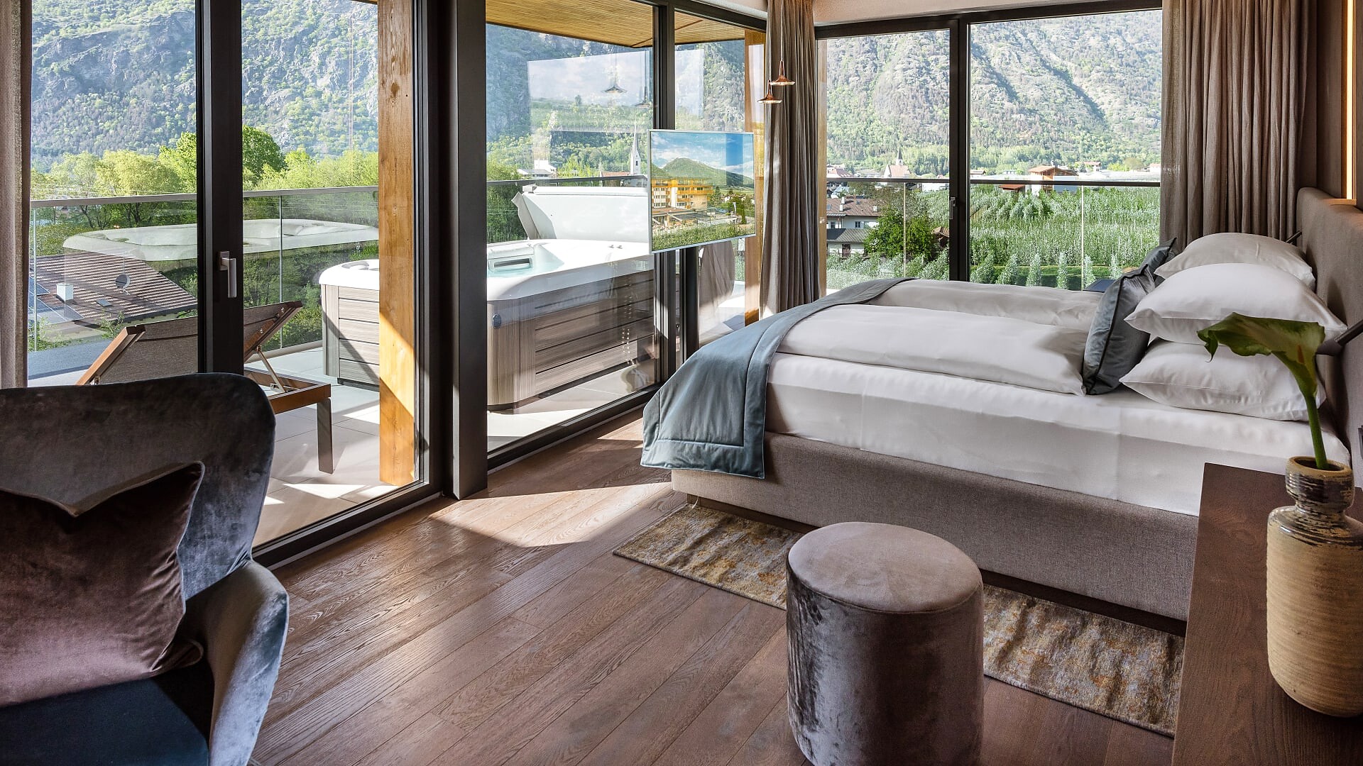 Camera doppia di 30 m² (balcone aggiuntivo di 10-15m²)Pavimento in legnoAria condizionataBalcone con lettino doppioVista su frutteti/montagneDay bed nel salottoBorsa wellness con accappatoio e asciugamani per tutto il soggiorno