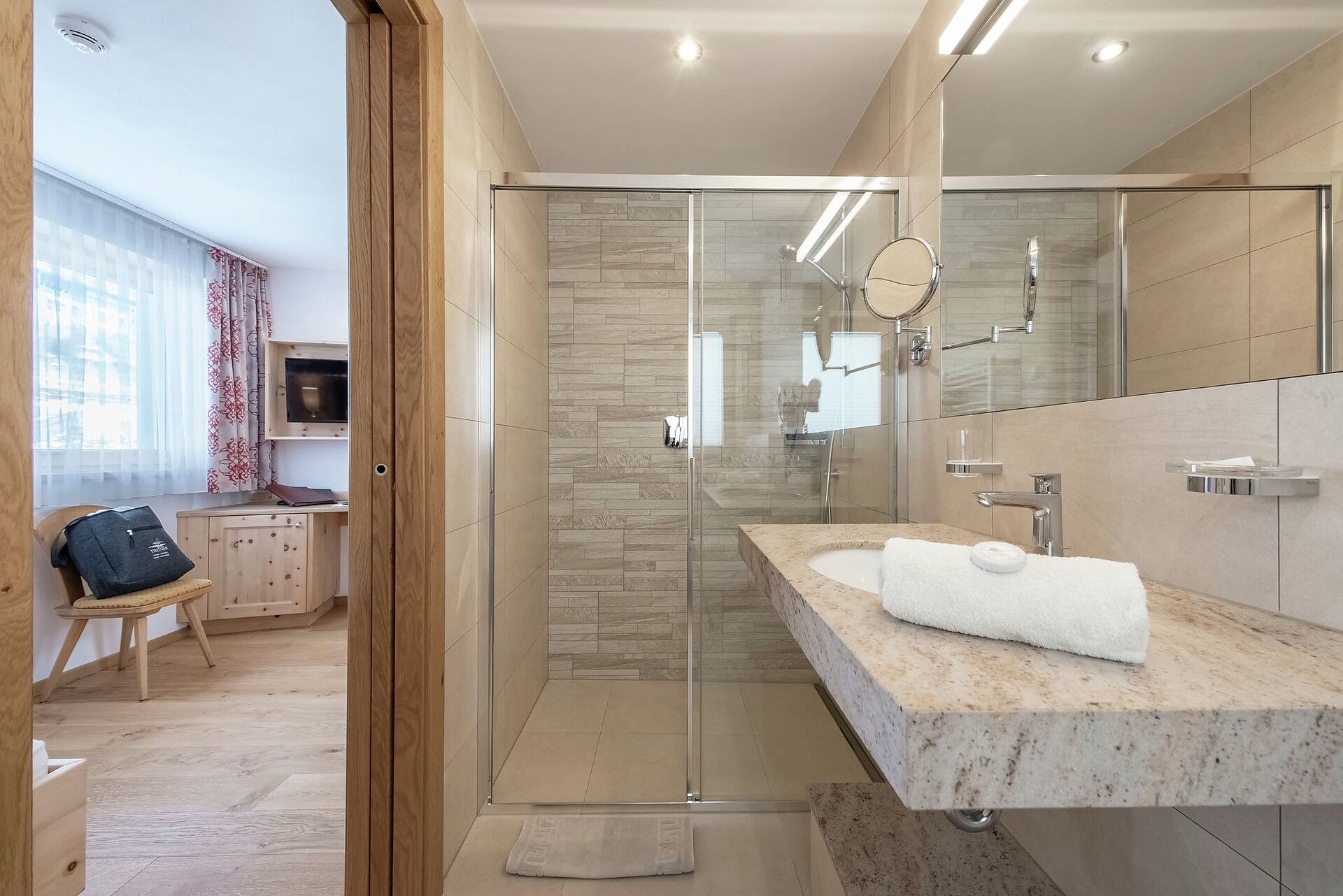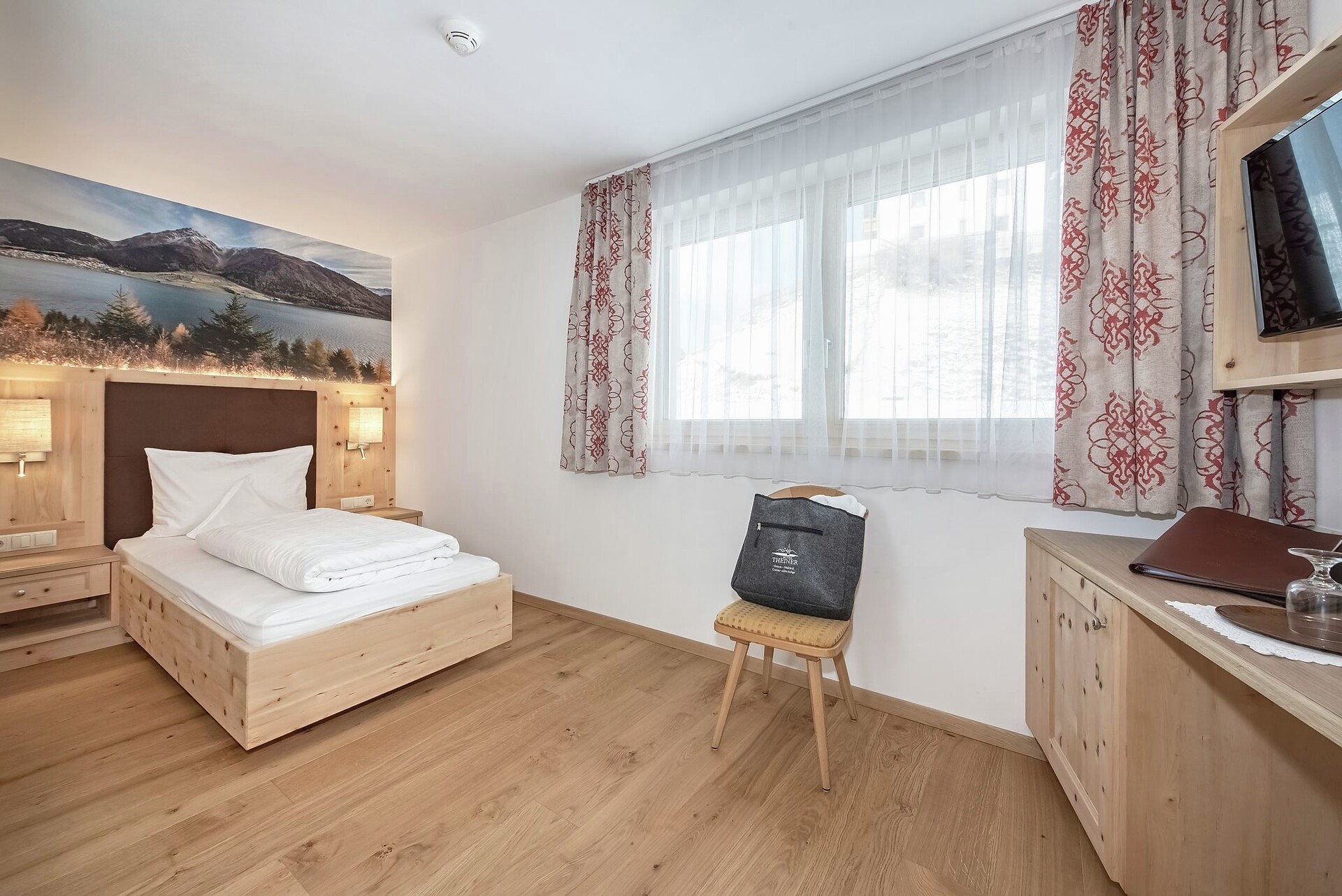 Le camere Alpin Relax sono di nuova costruzione, situate in posizione tranquilla a nord-est nel nuovo edificio verso la montagna e sono dotate di mobili in legno massello in legno di cembro e parquet in rovere. Il legno di conifere finemente profumato, proveniente dal pino cembro locale, ha un effetto calmante e un'influenza positiva per un sonno riposante. Le camere Alpin Relax, pur non avendo un balcone, offrono una splendida vista verso le montagne. Fanno parte dell’arredamento safe, scrivania, Wi-Fi gratuito. Il bagno ha un lavabo in marmo con ripiani, doccia, WC, fon. Accappatoi, ciabatte in spugna e borsa wellness con asciugamani per la sauna si trovano in camera e sono inclusi nel prezzo.