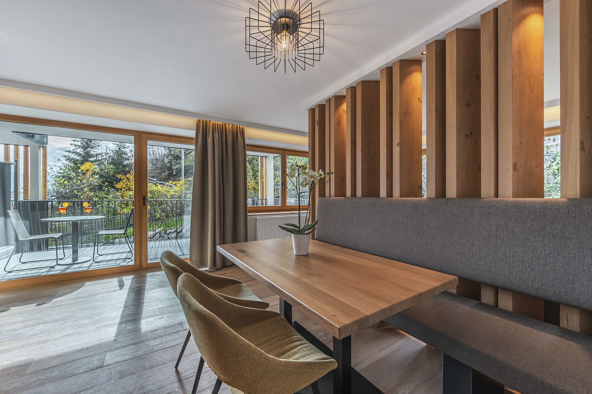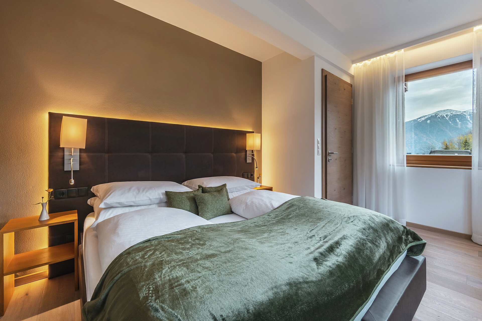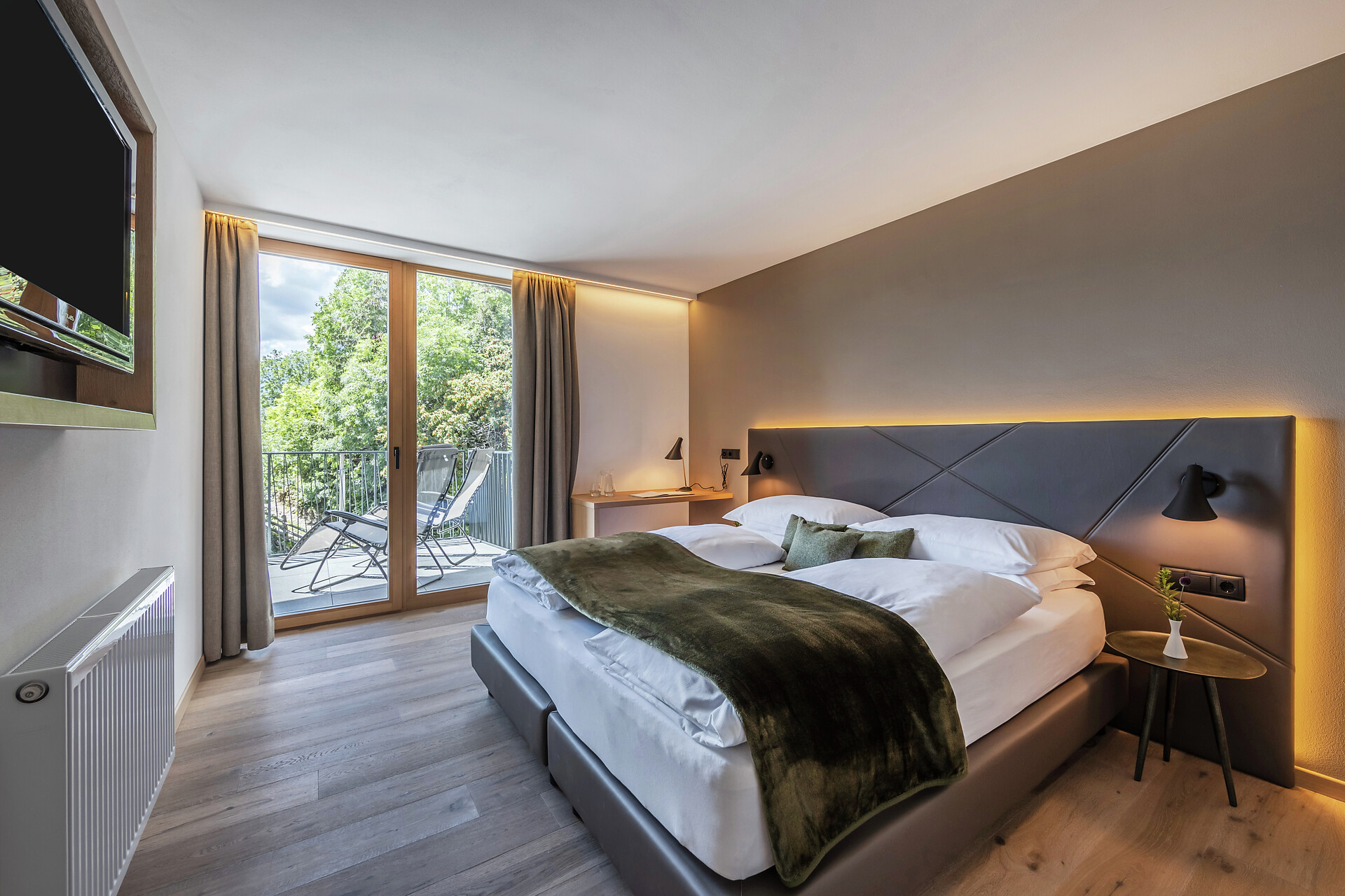 Ampia junior suite con balcone panoramico rivolto a sud o a ovest con vista sul Gruppo dell’Ortles. Le suite sono tutte arredate con stile.