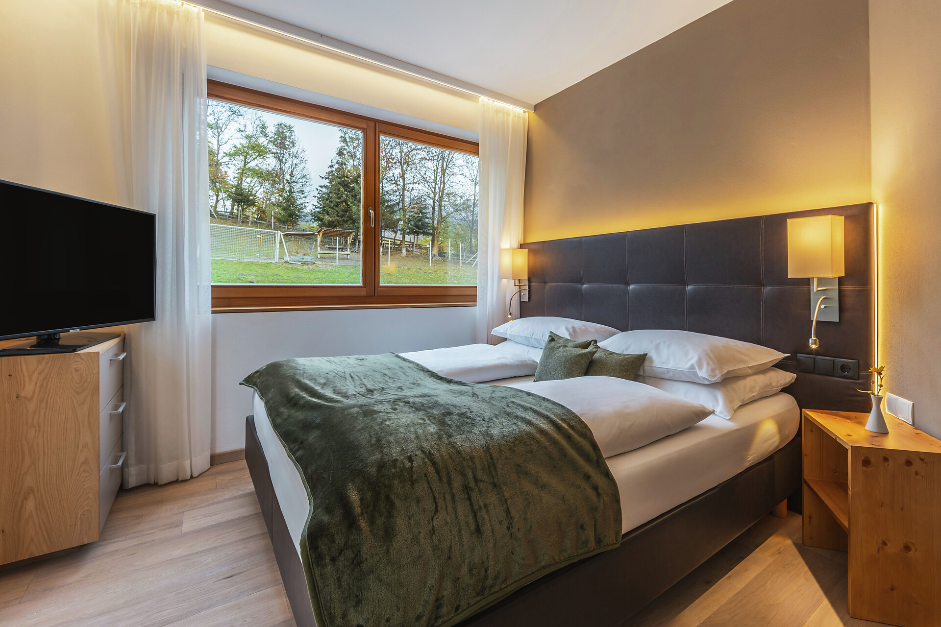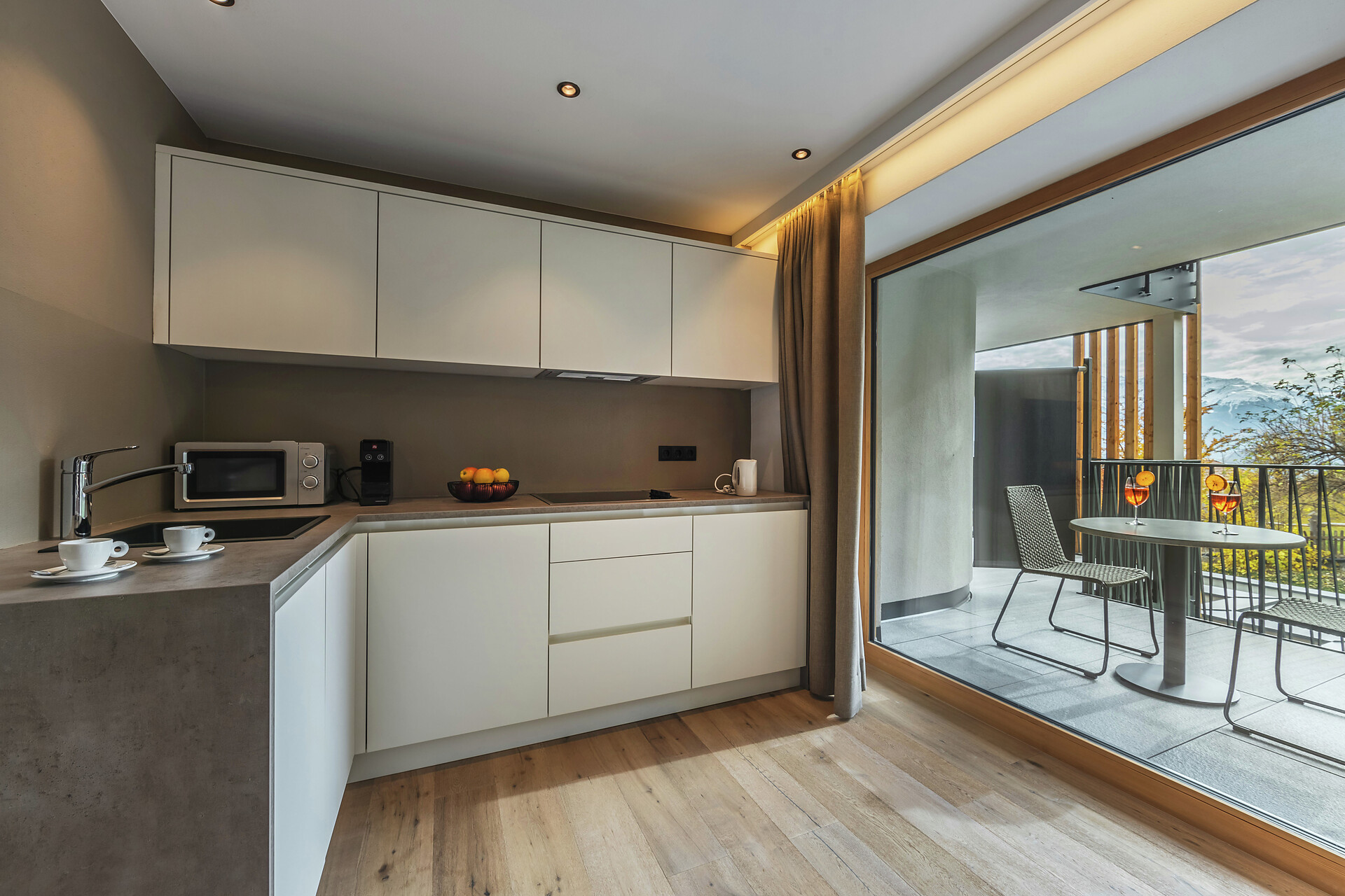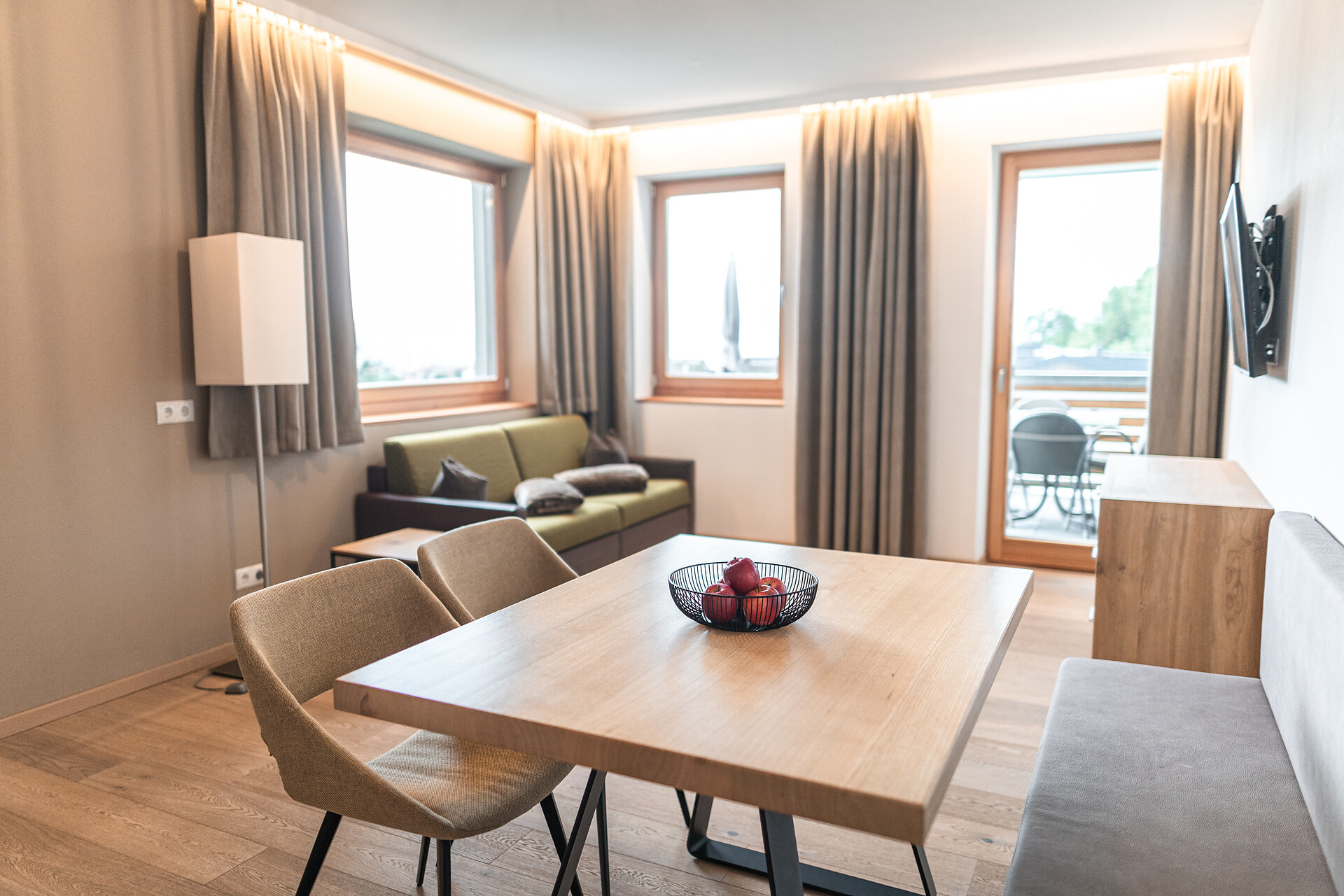 Ampia junior suite con balcone panoramico rivolto a sud o a ovest con vista sul Gruppo dell’Ortles. Le suite sono tutte arredate con stile.