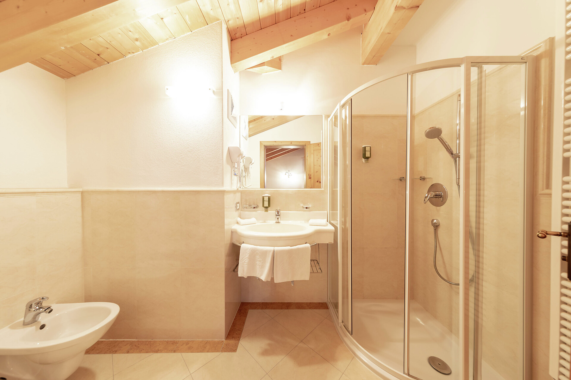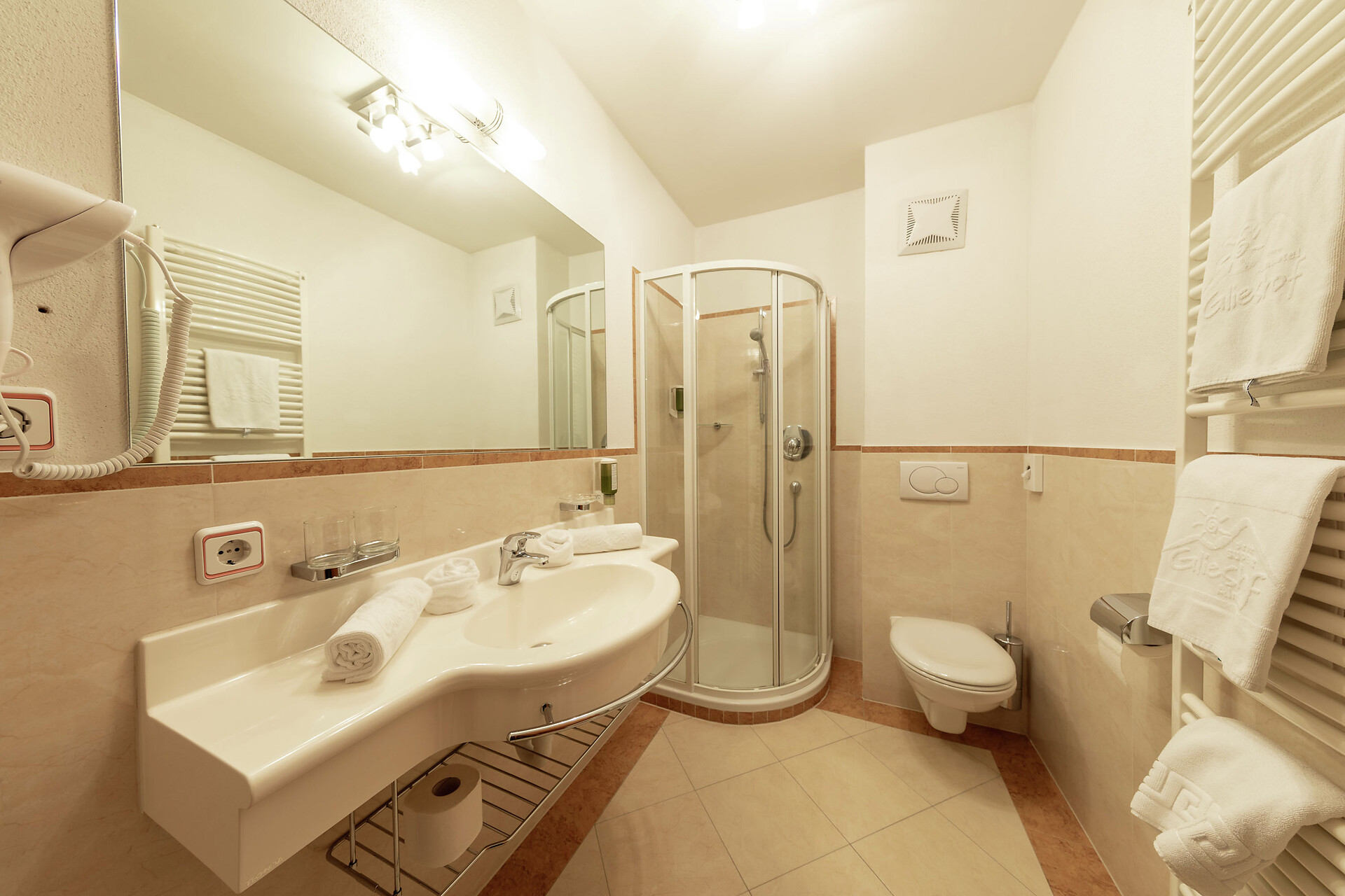 Arredamento in stile classico con moquette e balcone esposto a est con magnifica vista sulle montagne. Bagno dotato di doccia e WC. Borsa wellness con accappatoio, asciugamani e ciabattine per l’intera durata del soggiorno. TV, cassaforte, Wi-Fi gratuito.