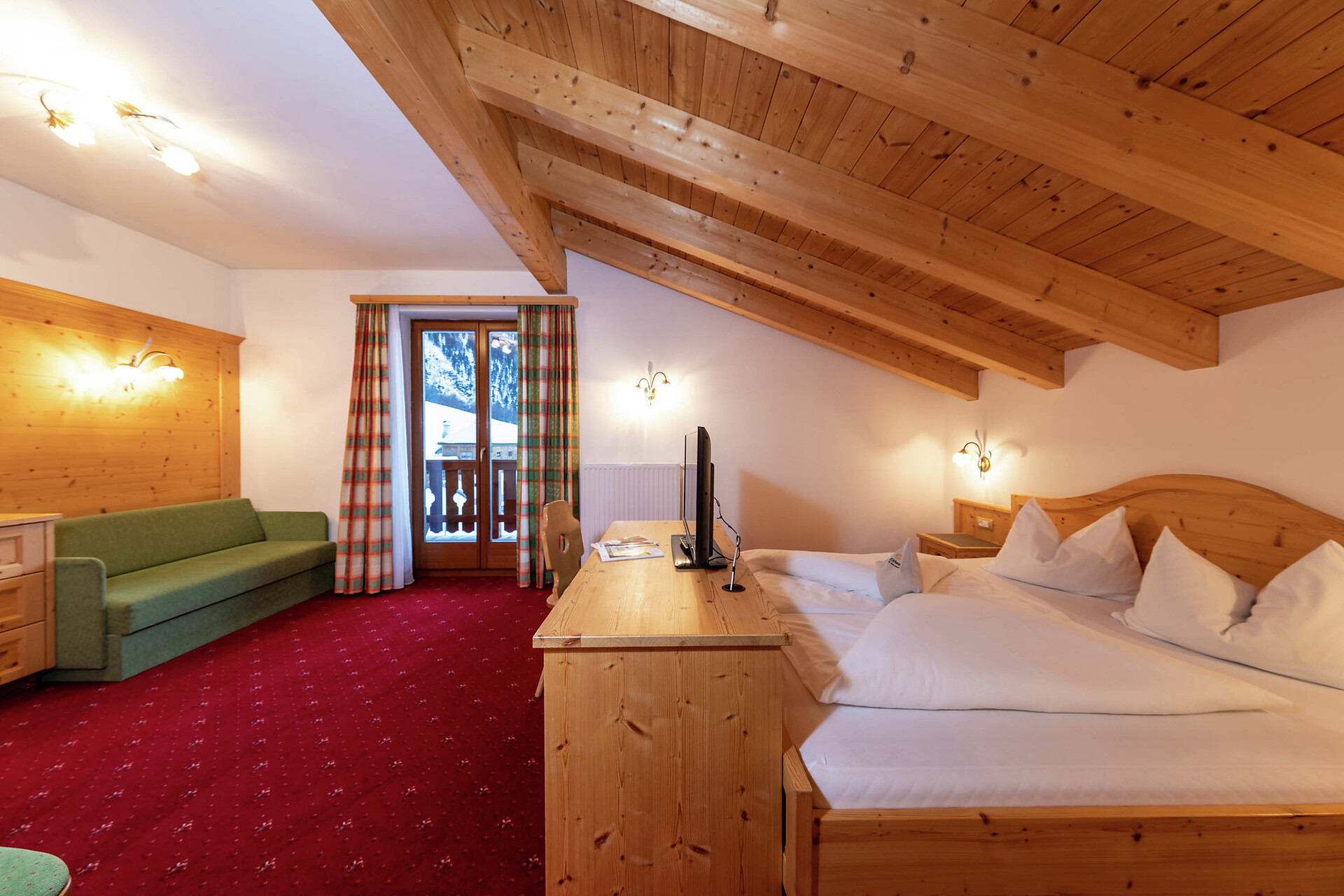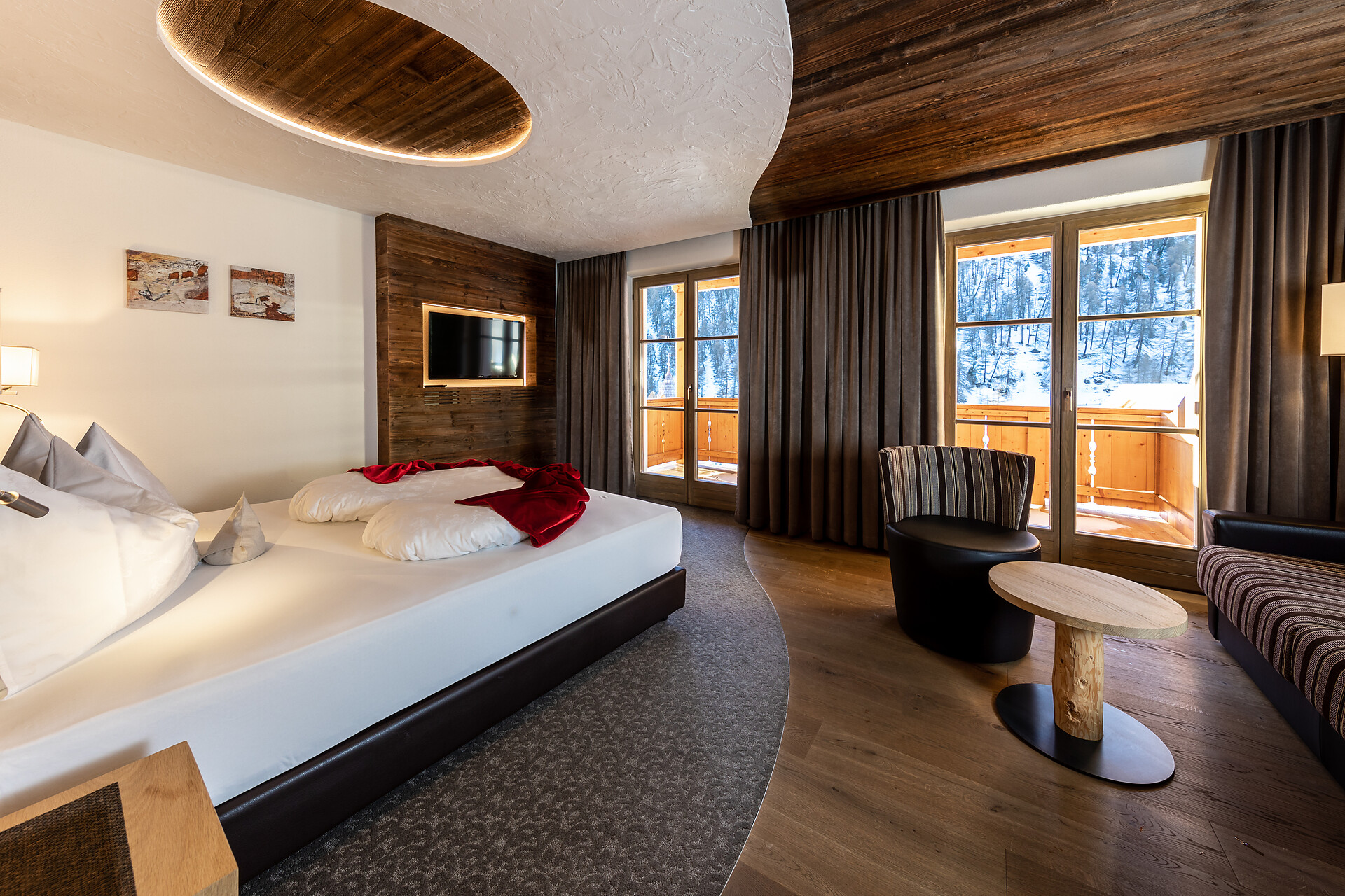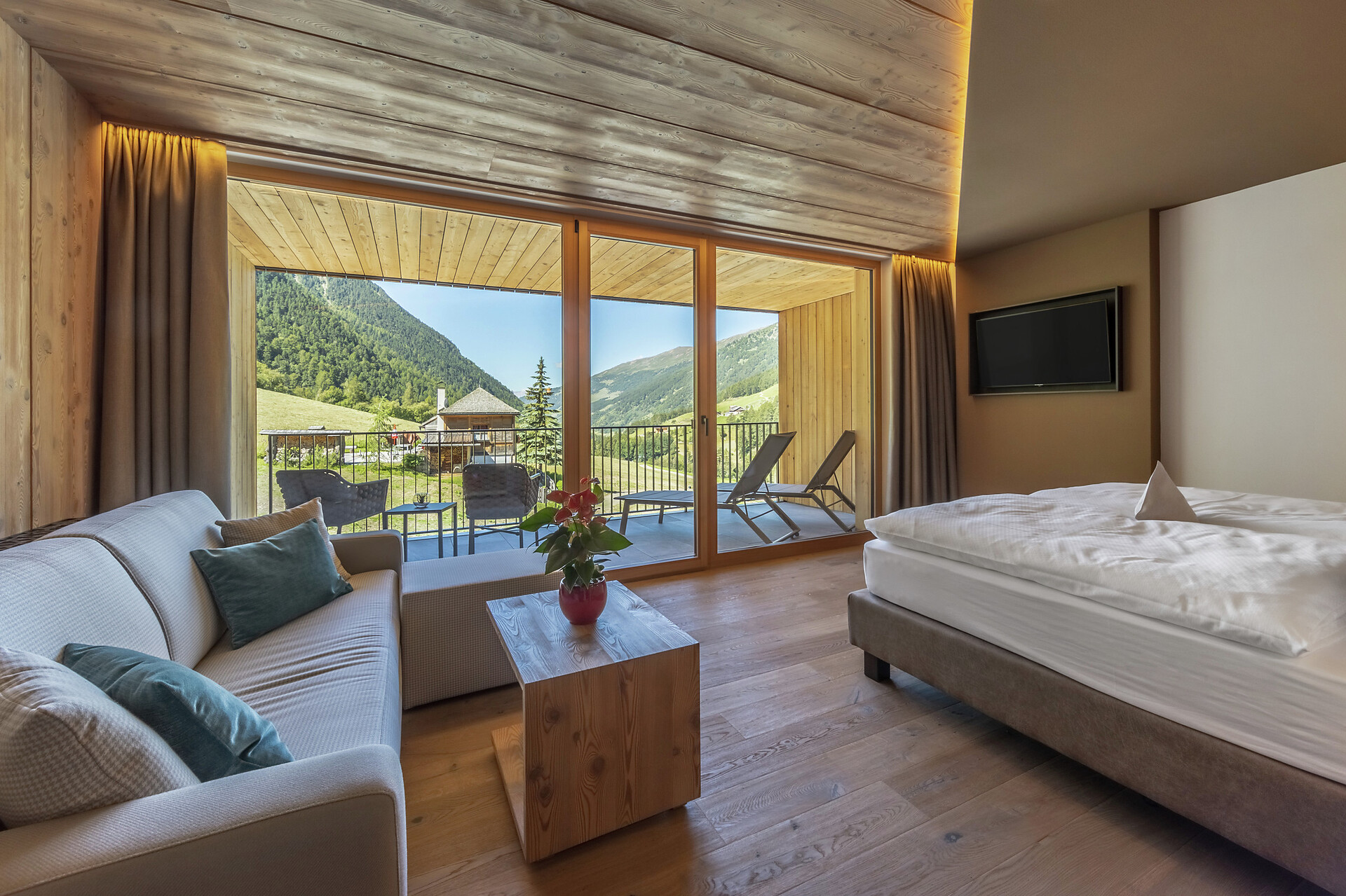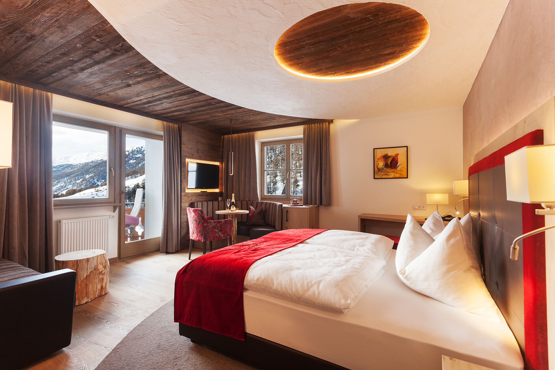 Camera dotata di arredi eleganti e balcone esposto a sud con lettini e splendida vista sulla valle. Dispone di bagno moderno con doccia e WC, divano e sedute, televisore, cassaforte, Wi-Fi gratuito e borsa wellness con accappatoi, teli e ciabattine per l’intera durata del soggiorno.