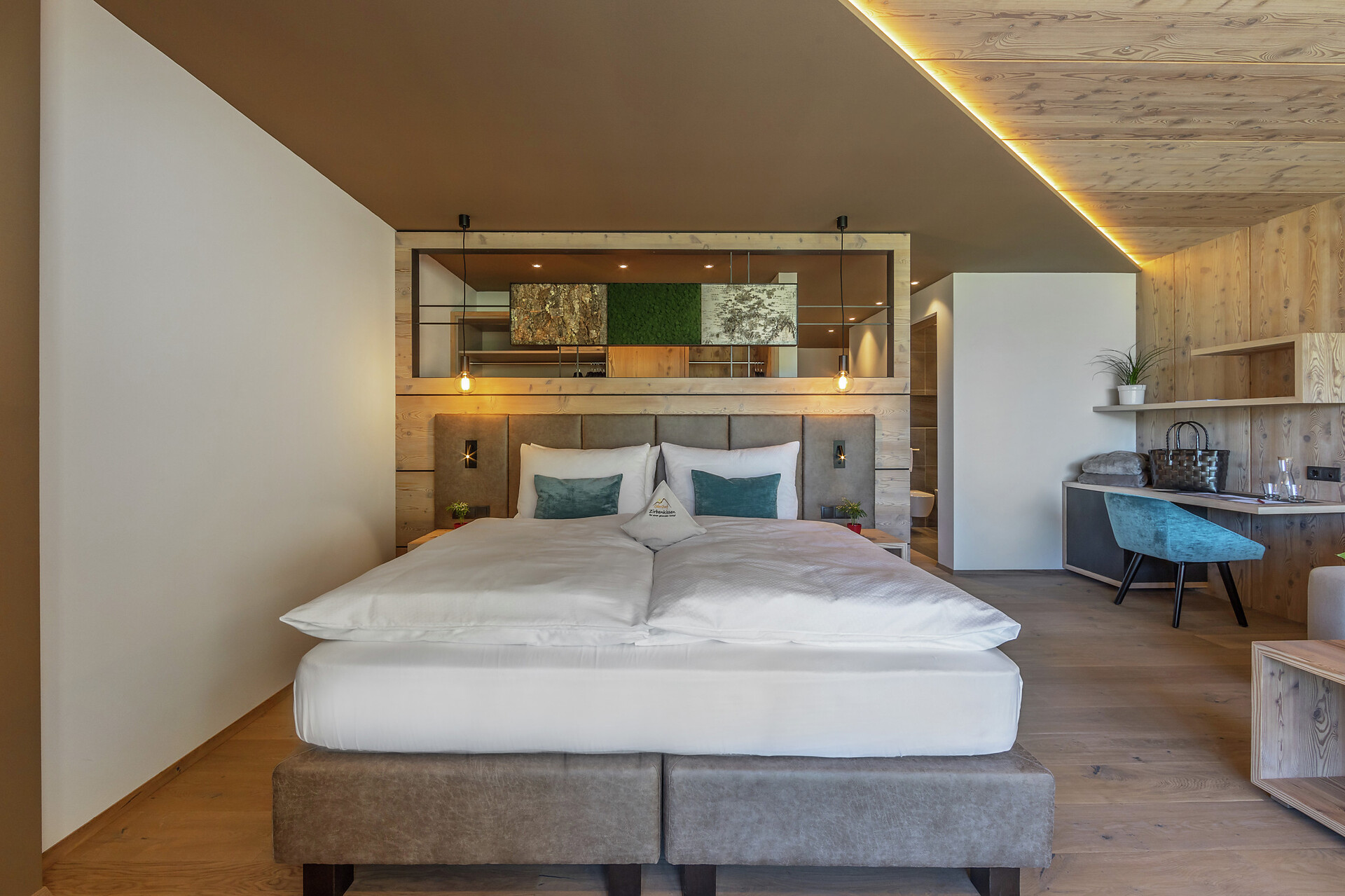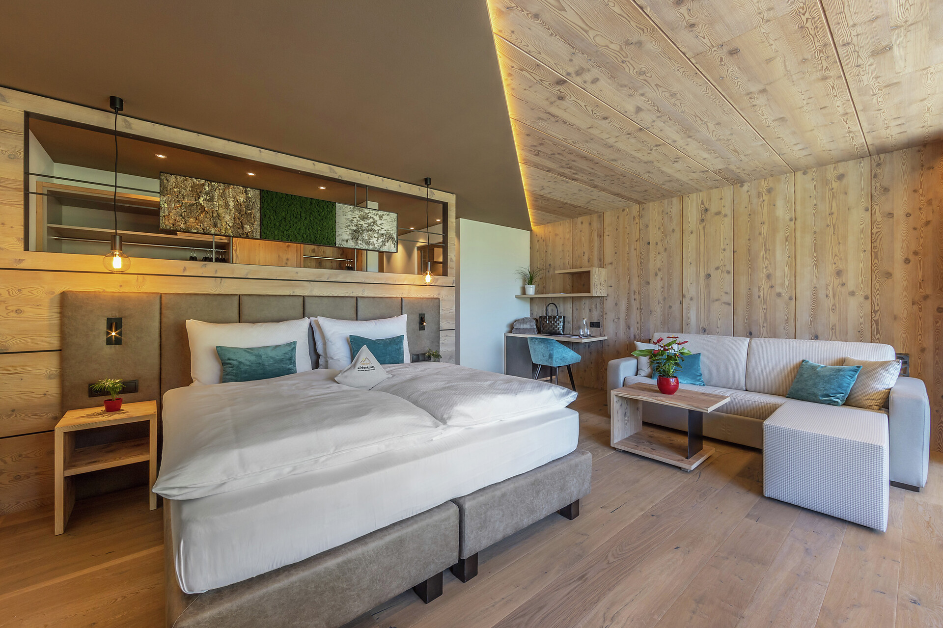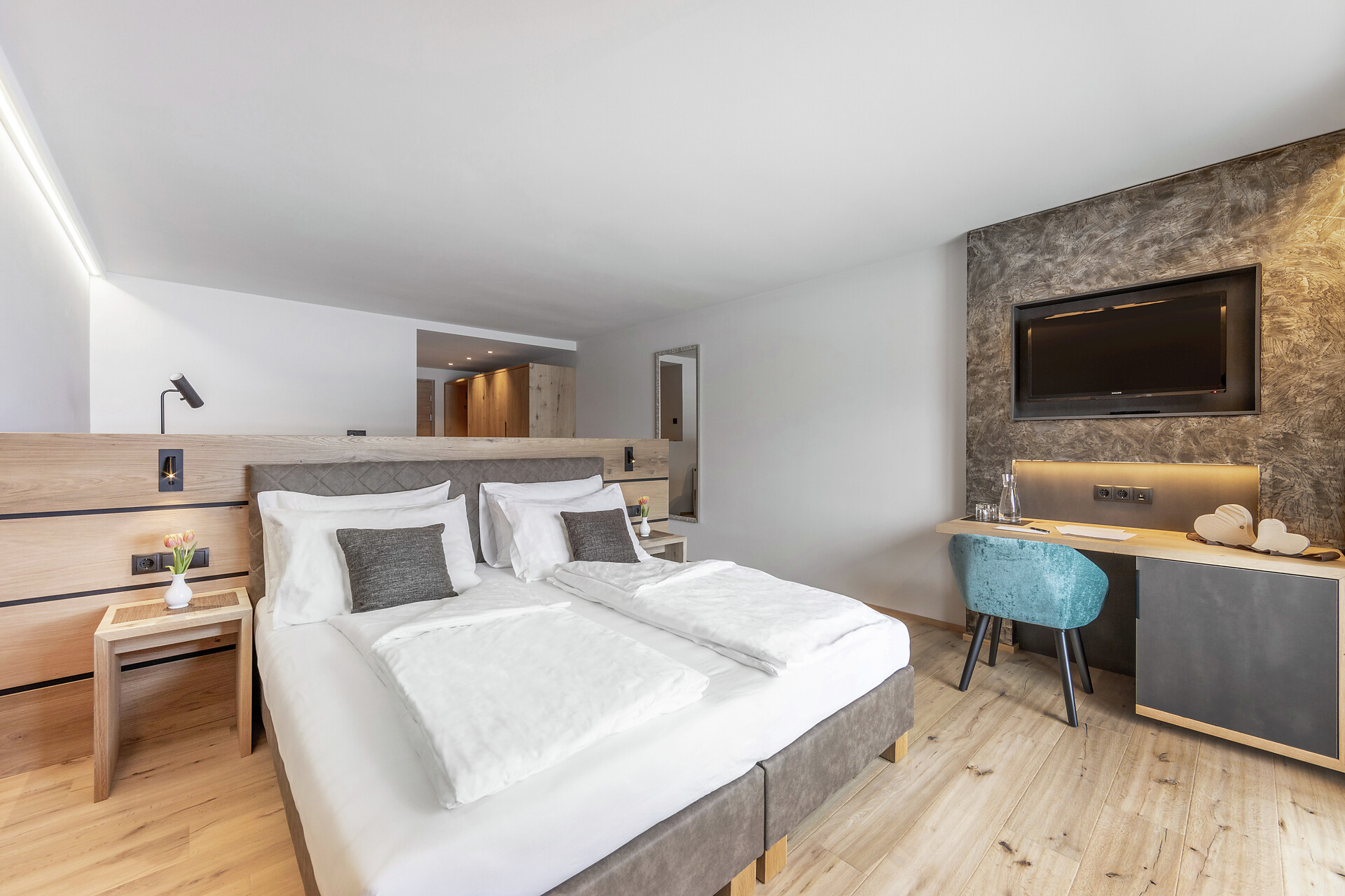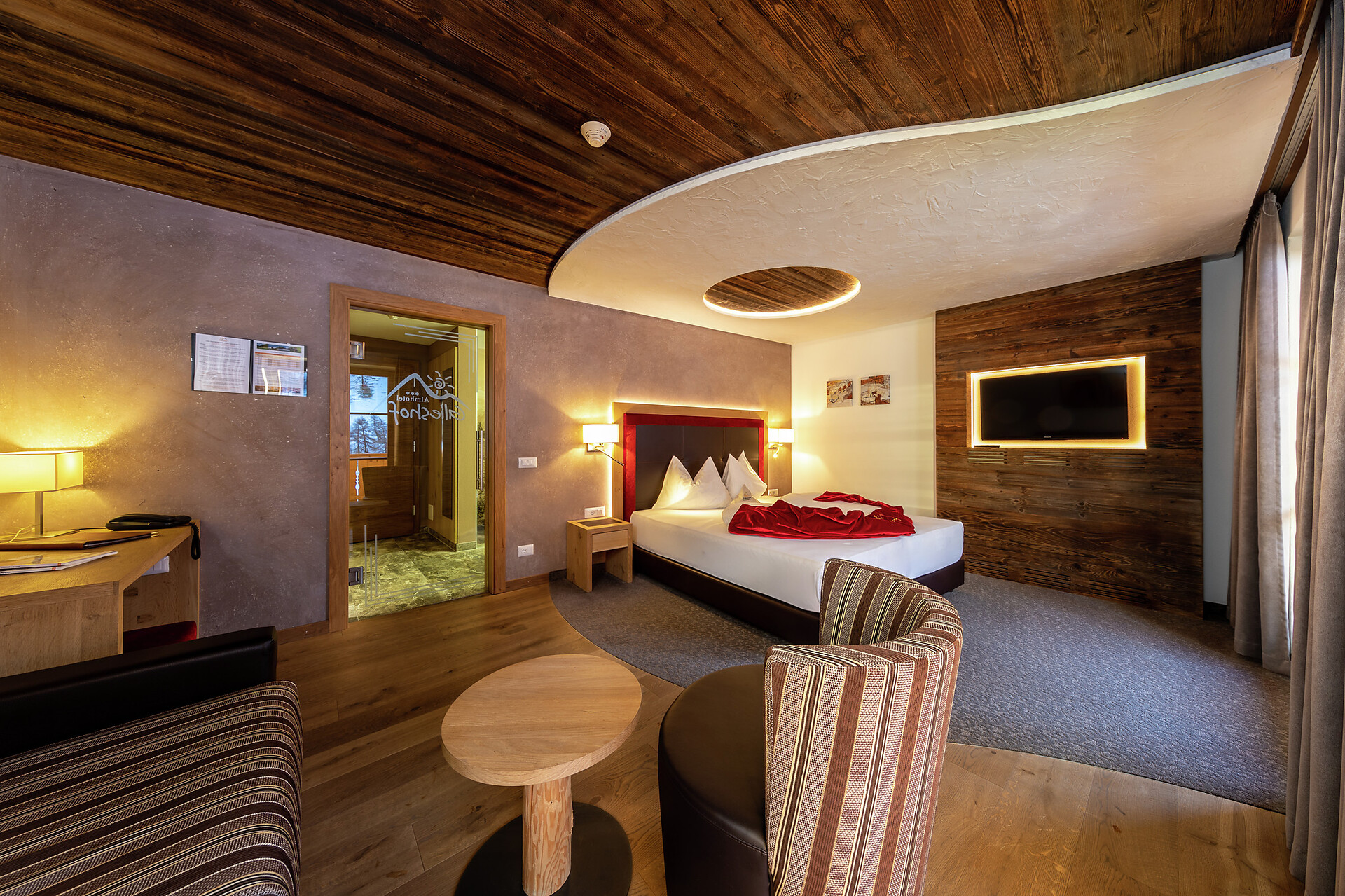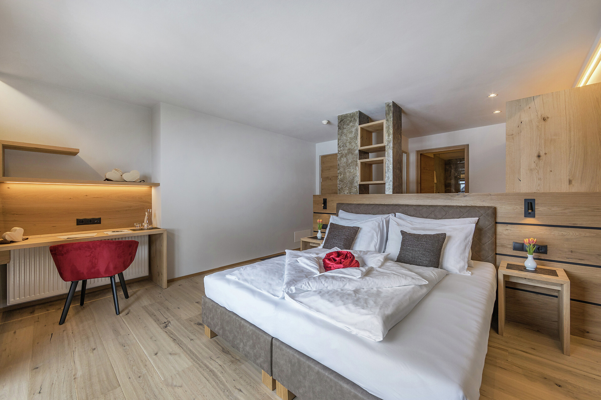 Camera dotata di arredi eleganti e balcone esposto a sud con lettini e splendida vista sulla valle. Dispone di bagno moderno con doccia e WC, divano e sedute, televisore, cassaforte, Wi-Fi gratuito e borsa wellness con accappatoi, teli e ciabattine per l’intera durata del soggiorno.