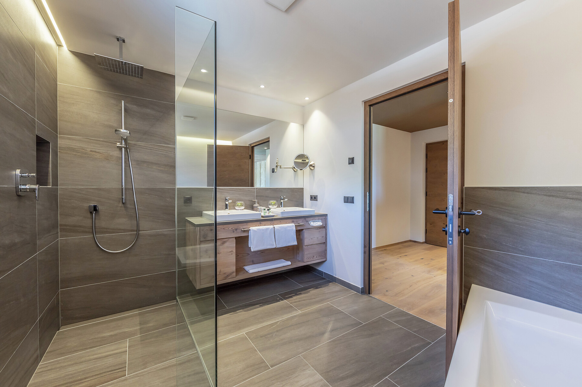 Camera con ampia loggia esposta a sud e vista panoramica, dotata di lettini. Dispone di bagno moderno con doccia, WC separato, divano, scrivania, televisore, cassaforte, Wi-Fi gratuito, posto auto riservato nel garage sotterraneo e borsa wellness con accappatoi, teli e ciabattine per l’intera durata del soggiorno.