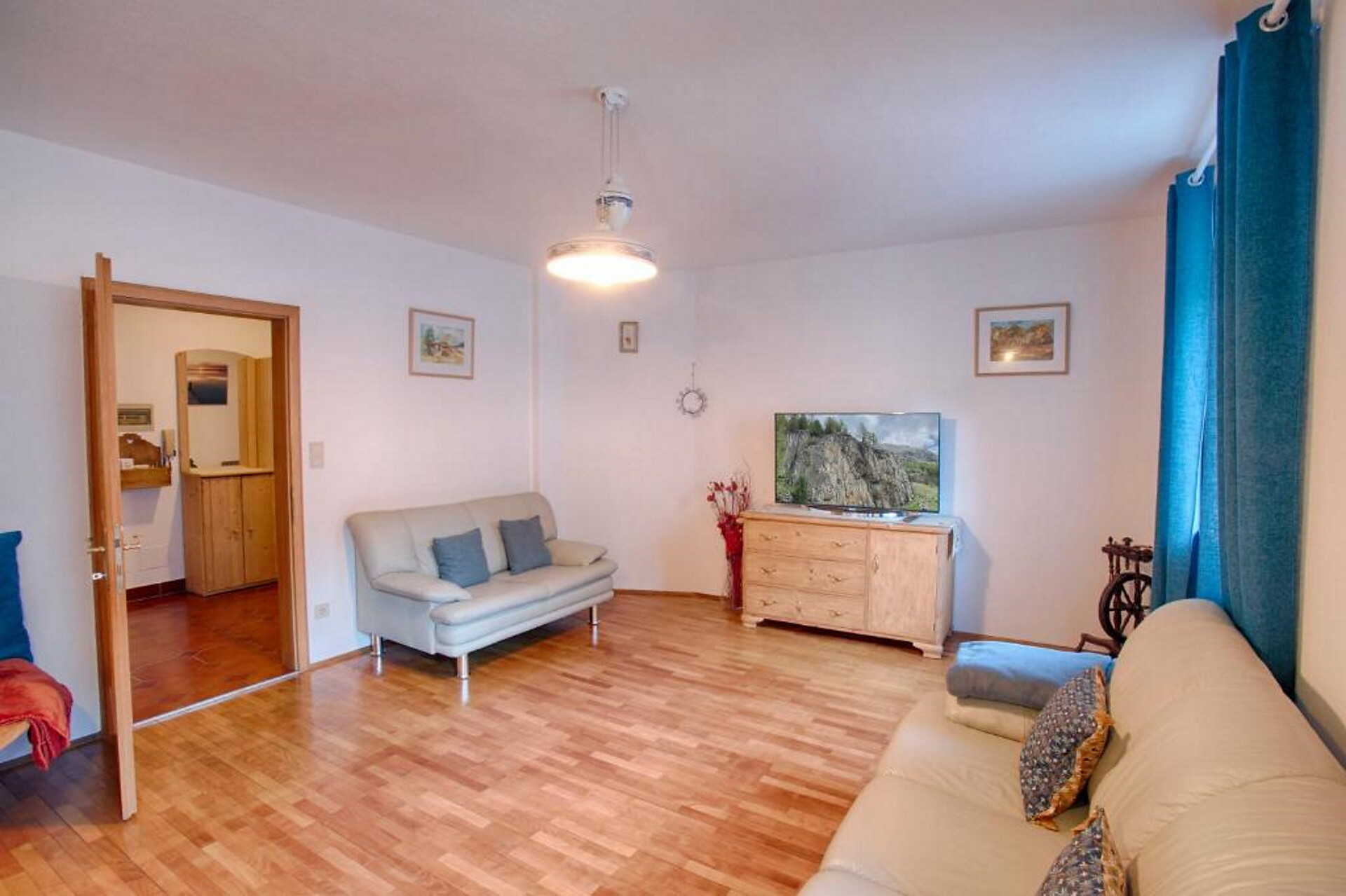 Le ampie finestre inondano l'appartamento di luce naturale e offrono una vista unica sulle montagne e sul paese. L'appartamento è molto spazioso e allo stesso tempo affascina con un'atmosfera molto accogliente.
