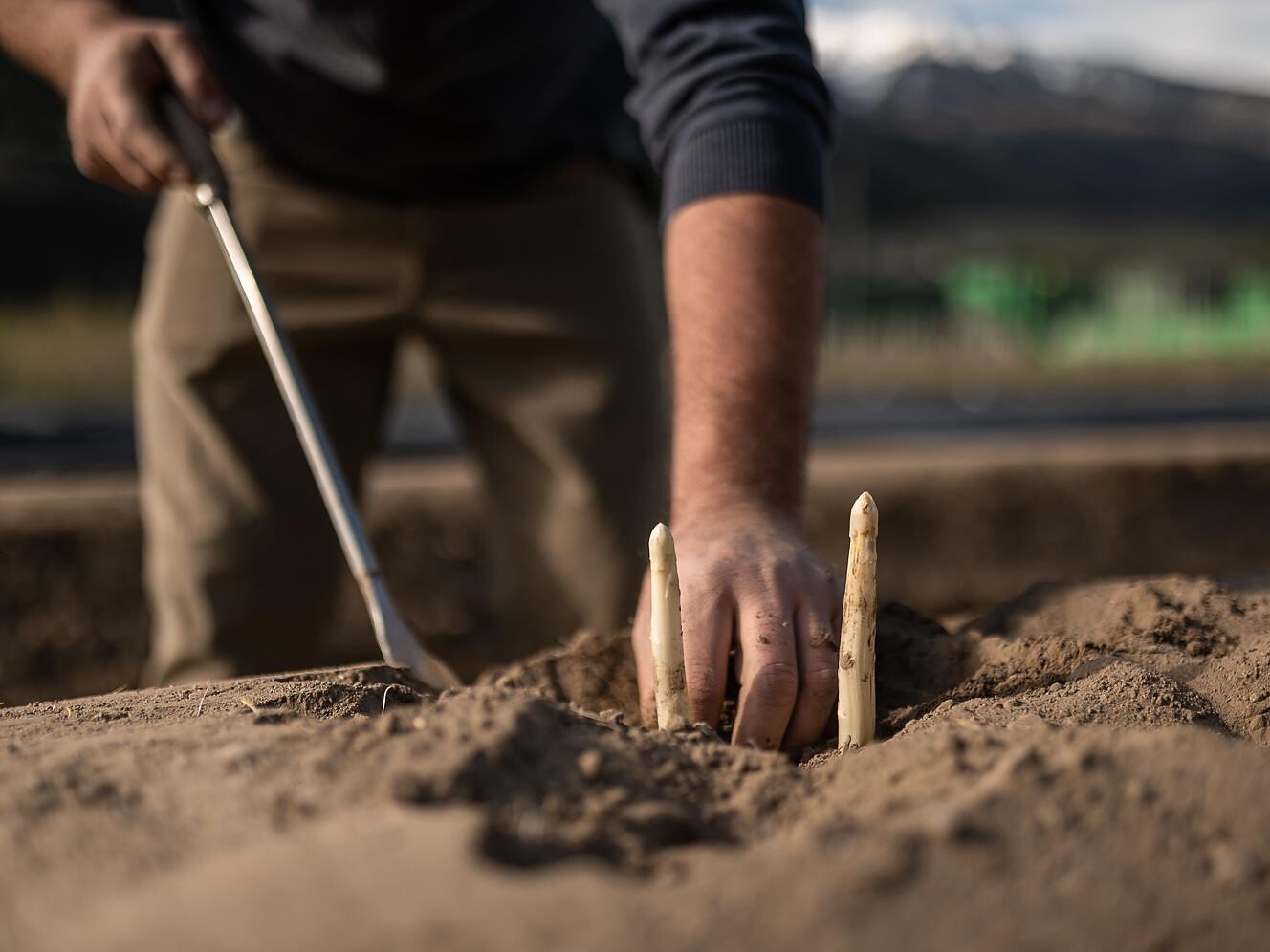 Scoprite la coltivazione e la qualità degli asparagi di Castelbello, l'influenza del clima sul sapore e sull'aroma e molti altri dettagli interessanti su questo nobile ortaggio durante una passeggiata nel campo di asparagi con il coltivatore di asparagi Martin Pohl della cantina Köfelgut.