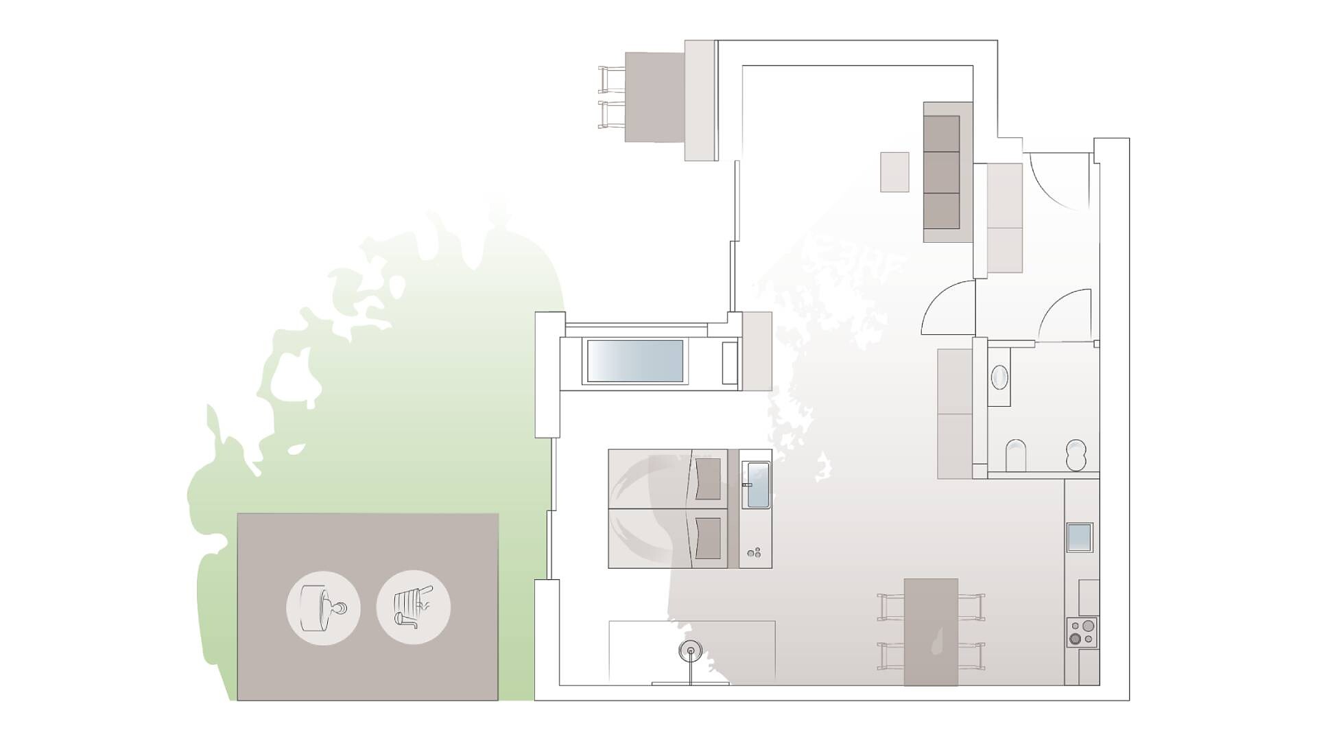 Terrazza coperta arredata di 28 m² con tavolo da pranzo, sedie e lettini prendisole. Giardino SPA privato di 100 m² con vasca idromassaggio e sauna solo per voi. Anticamera con guardaroba. Cucina attrezzata con zona pranzo e macchina da caffè automatica Zona soggiorno con divano letto, TV LCD con ricezione satellitare Camera da letto con letto matrimoniale, vasca da bagno, doccia, WC separato Frigorifero per vini con bevande (riempito su richiesta e a pagamento)