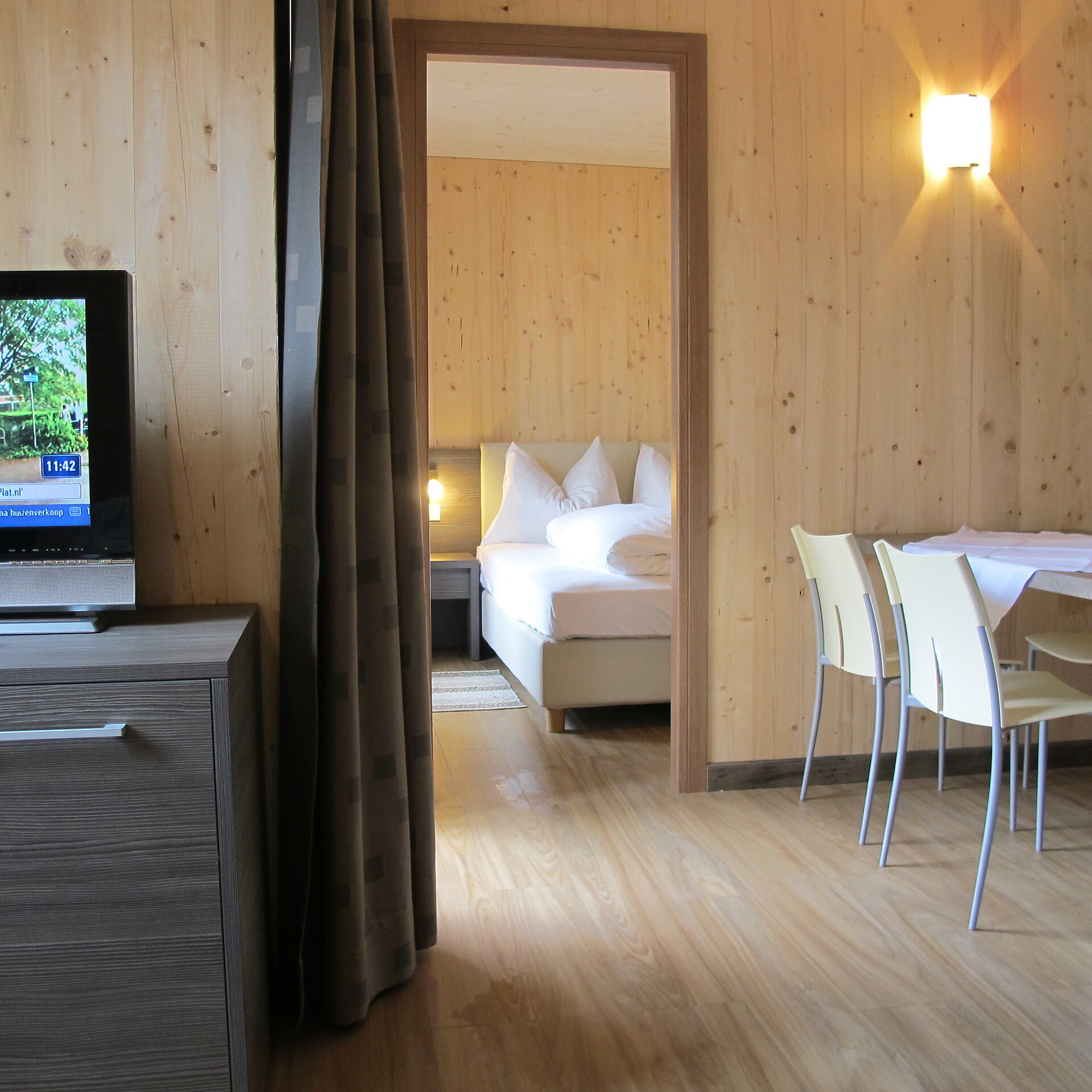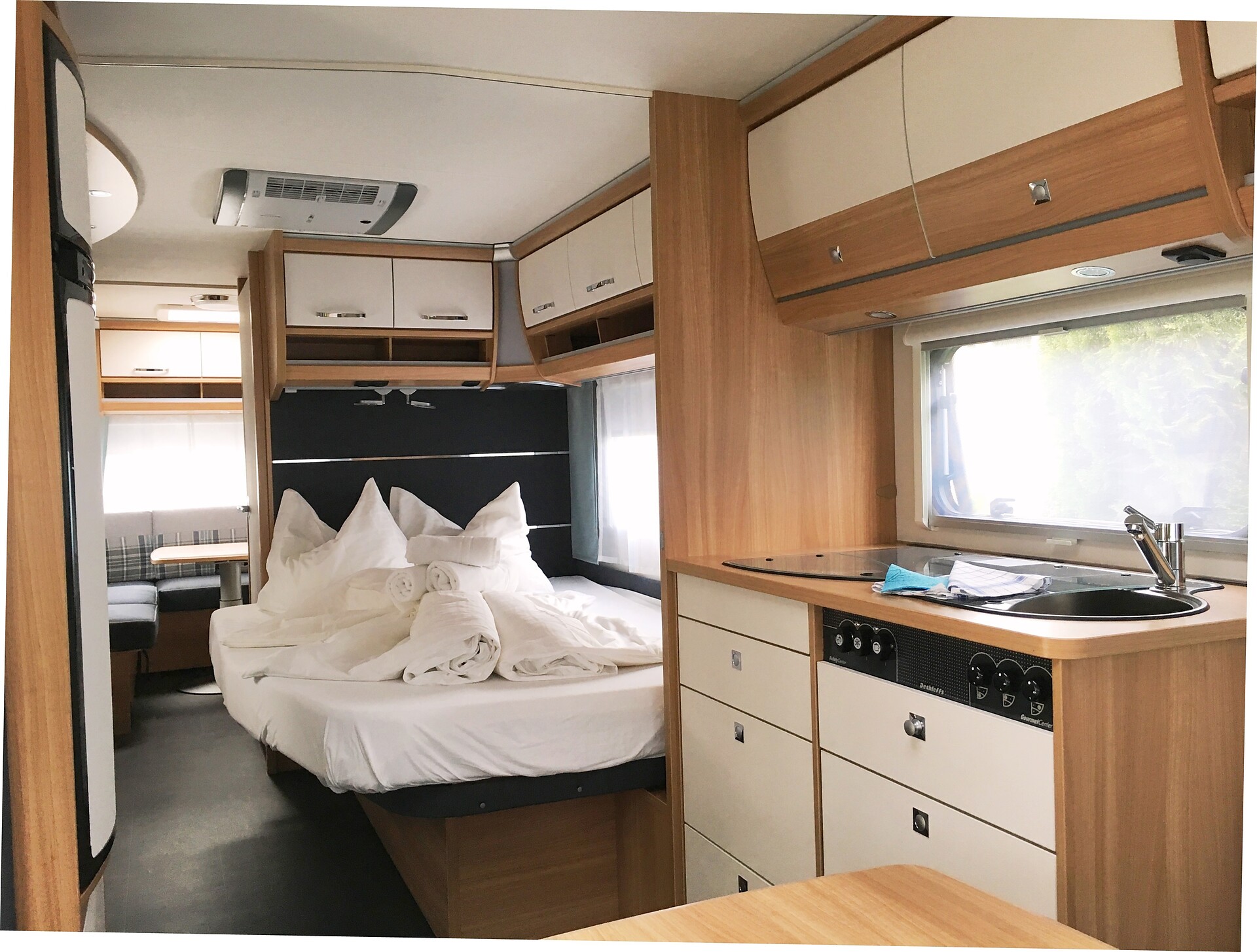 Caravan di lusso con letto matrimoniale, letto a castello, zona giorno e pranzo e cucina a vista. Biancheria da letto, asciugamani e comfort come WC chimico, riscaldamento a pavimento e aria condizionata sono inclusi. La veranda con tavolo in legno, panca e ombrellone invita a momenti di relax all’aperto.