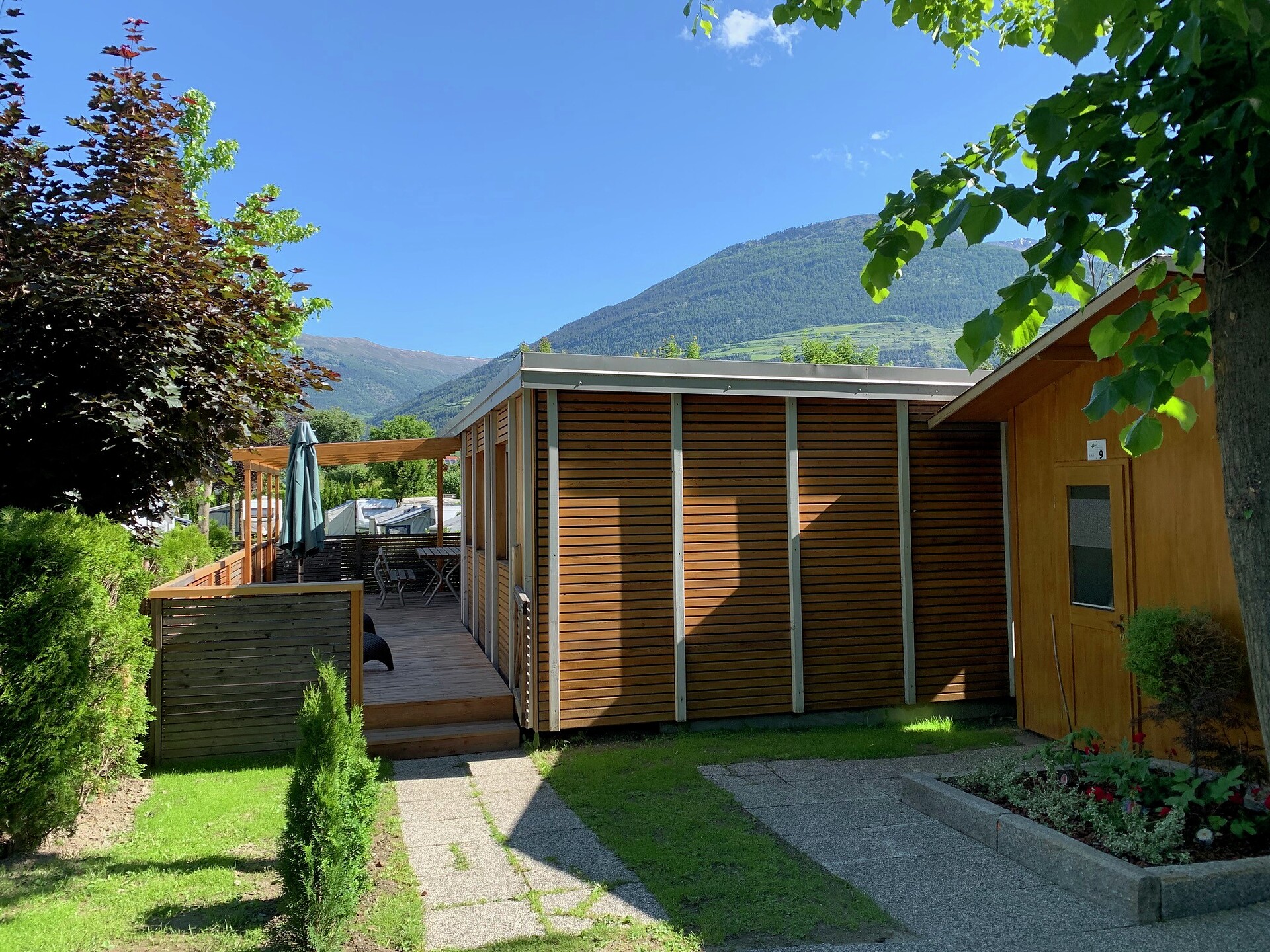 Le piazzole Standard (circa 60–80 m²) si trovano su un prato aperto e curato, con alberi a foglia caduca e alcune siepi di tuia. La posizione aperta crea un’atmosfera piacevole e offre una vista panoramica sul paesaggio montano circostante.