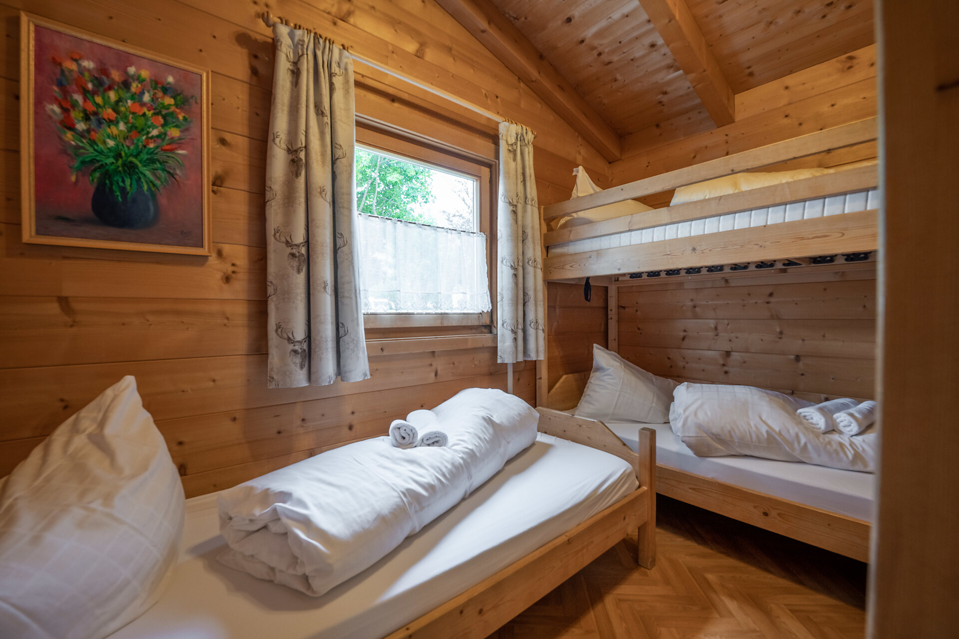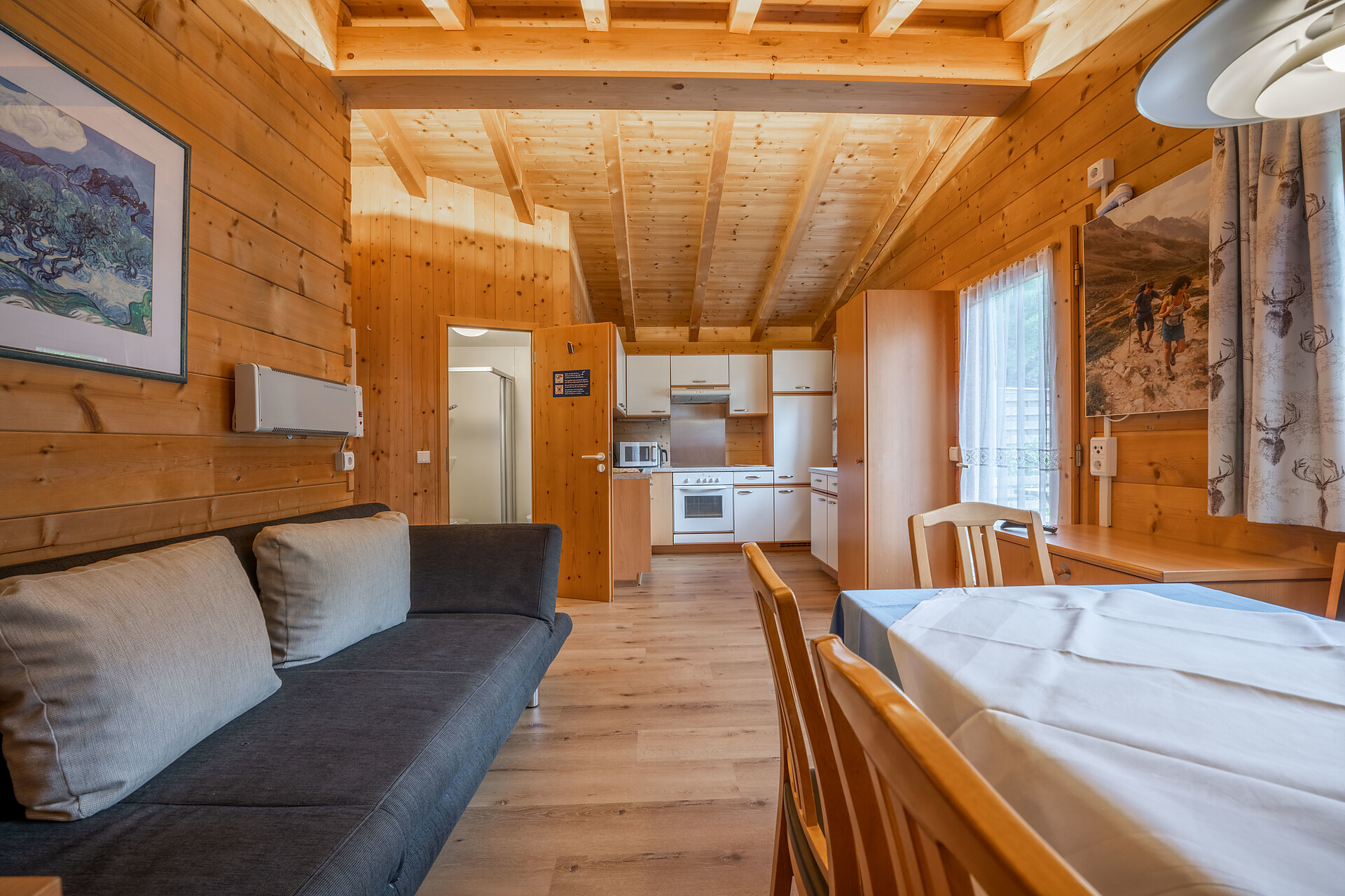 Chalet in legno con due camere da letto: matrimoniale e cameretta con letto singolo e a castello. Zona giorno con divano letto, cucina e bagno. Terrazza con tavolo, panche e sdraio – perfetto per vacanze a contatto con la natura e relax.