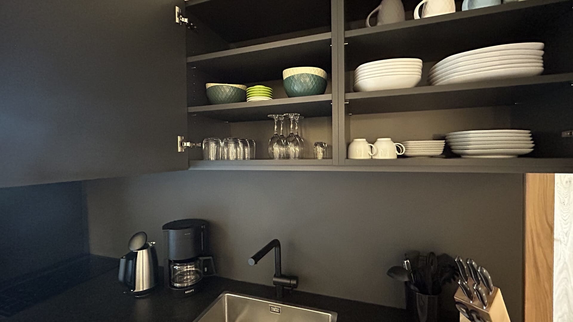 Cucina completamente attrezzata con zona pranzo, macchina per caffè filtro, microonde, bollitore e lavastoviglie