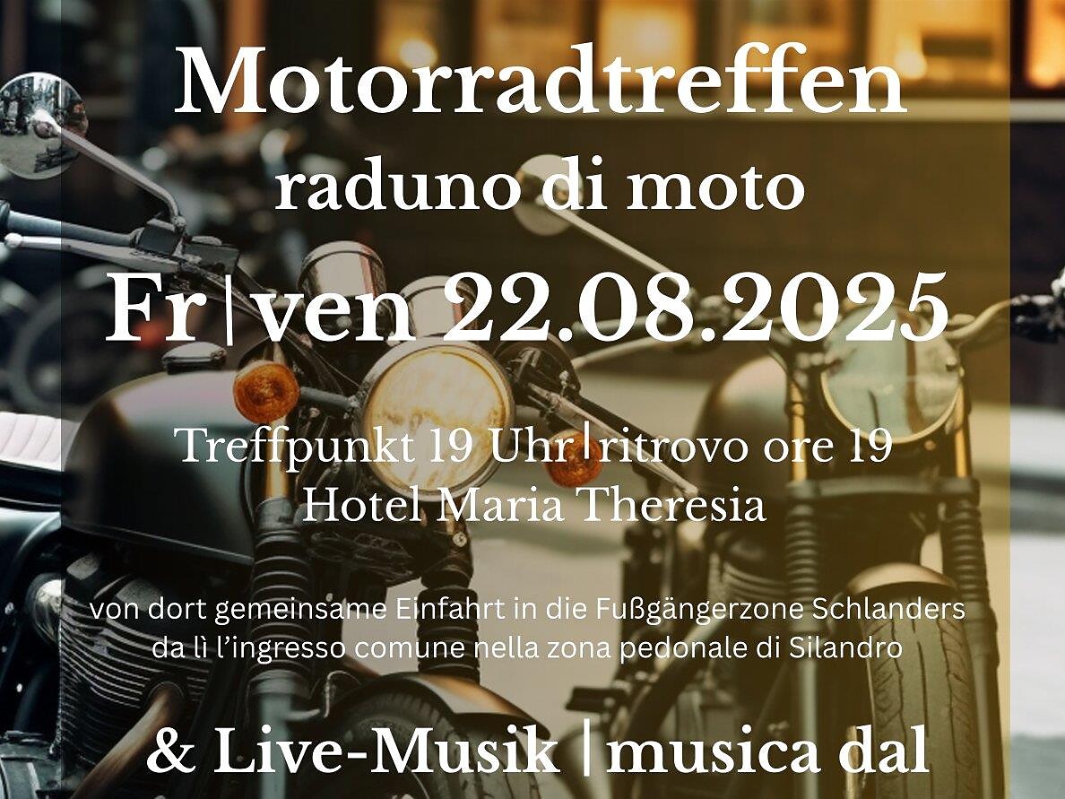 Gli albergatori di Silandro invitano tutti gli entusiasti di moto ad un incontro con entrata collettiva nella zona pedonale di Silandro e presentazione dei moto.