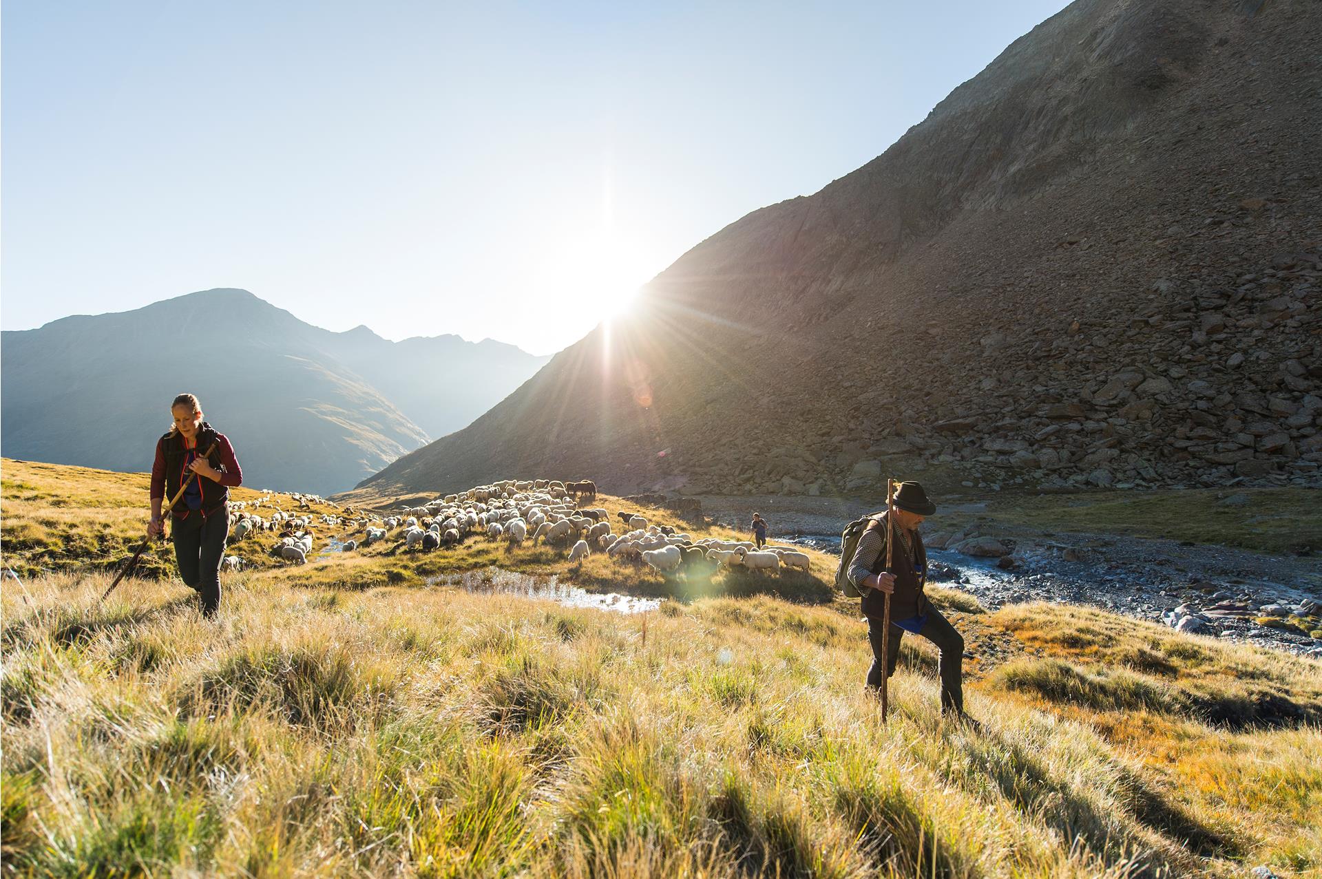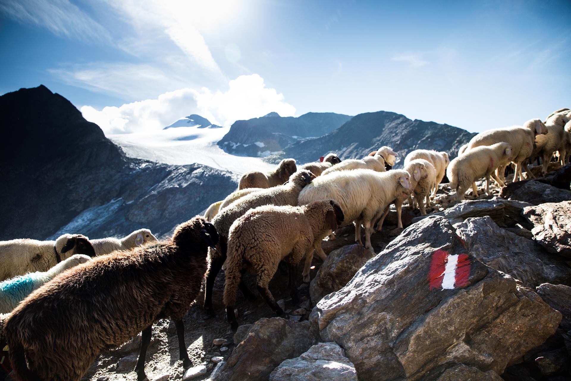 Fino a 2.200 pecore e 300 capre partono al mattino presto dalla Niedertalalm nella valle di Vent (A), passando accanto al rifugio Martin Busch (ristoro e pernottamento), attraverso terreno d’alta montagna (non pericoloso) fino al Niederjoch (3.019 m) e al rifugio Similaun (ristoro e pernottamento), dove il primo gruppo arriva già verso le 9:00. Segue poi il tratto più impegnativo della discesa, soprattutto in presenza di neve o ghiaccio. Sotto il rifugio, il percorso scende su un sentiero stretto attraverso terreno ripido e roccioso fino a circa 2.600 metri. Successivamente il terreno diventa più dolce e sicuro. Dopo una sosta nella parte centrale della valle Tisental, la mandria prosegue verso Vernago, dove arriva intorno alle 14:00. Già da lontano si può osservare una lunga fila di pecore che sembra non finire mai. L’arrivo delle greggi viene celebrato con tradizionali feste dei pastori, con piatti tipici, bevande e musica.